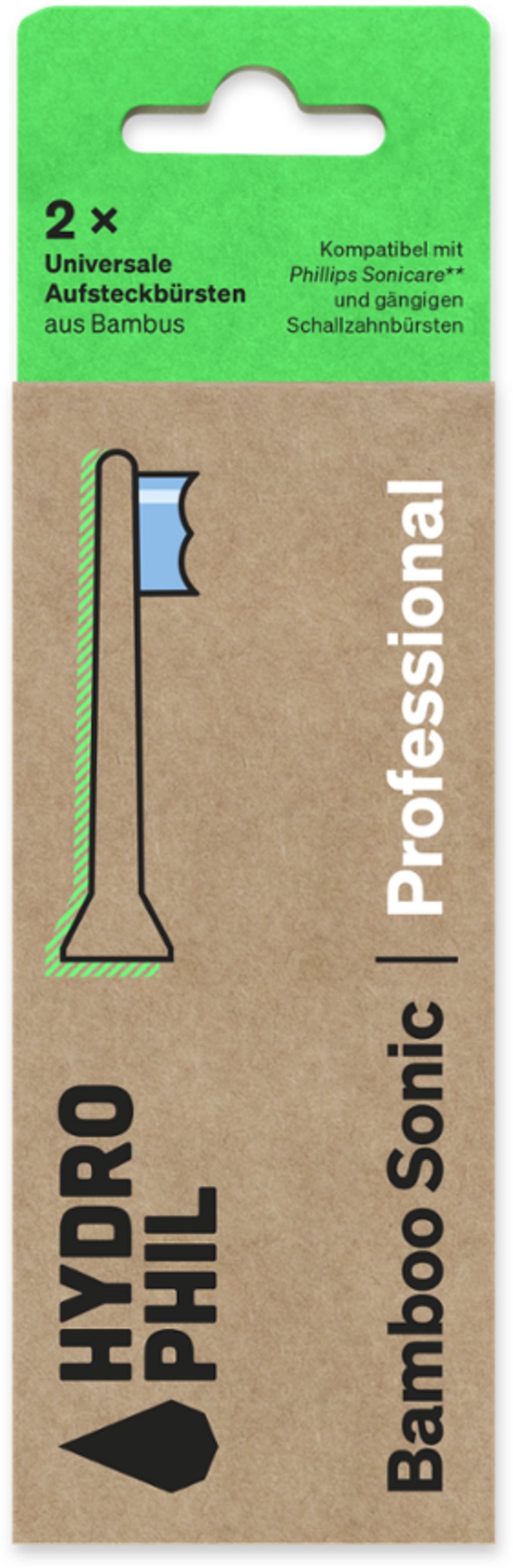 Med Bamboo Sonic Professional tilbehørshoder finnes det endelig en bærekraftig løsning for elektriske tannbørster. De er kompatible med vanlige elektriske tannbørster og Philips Sonicare. Tilbehørshodene er laget 100% fra fornybare ressurser: Børstene med multilevel-børsteprofil er middels myke og fjerner plakk samt rengjør tennenes overflater og mellomrom skånsomt. Inlayet blir presist laget av formstabil bioplast fra maisstivelse, og er svært slitesterkt. De avrundes med et casing av Moso-bambus.