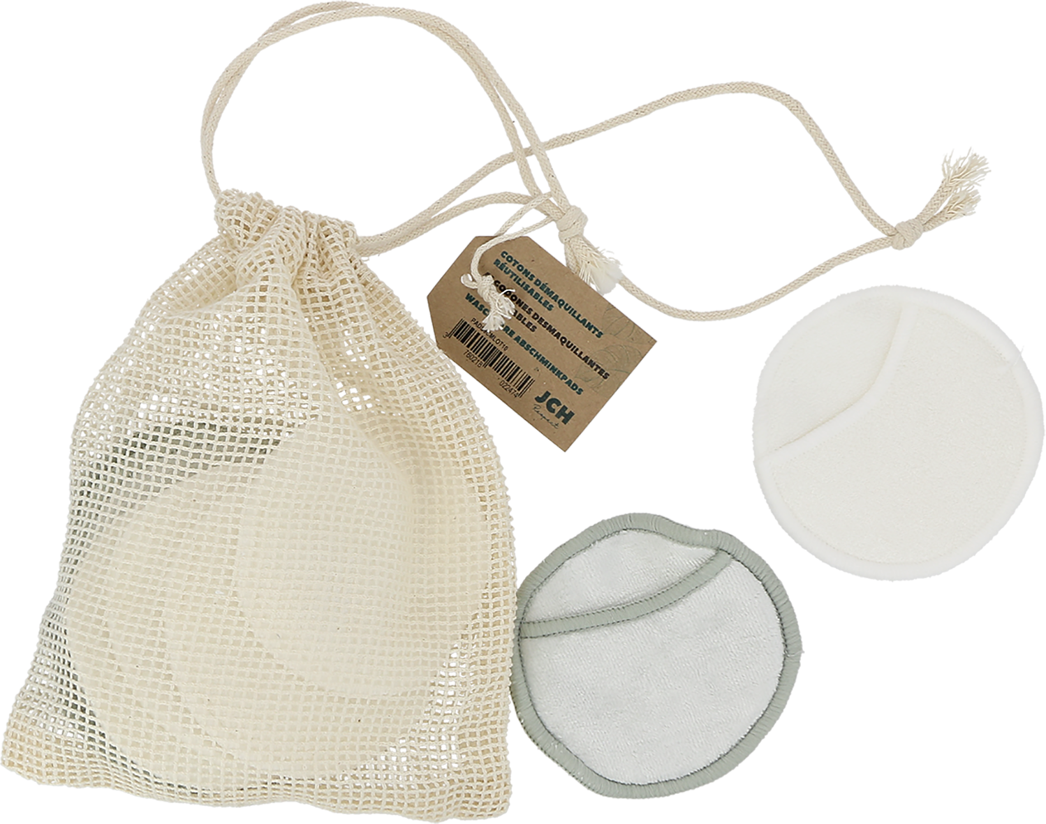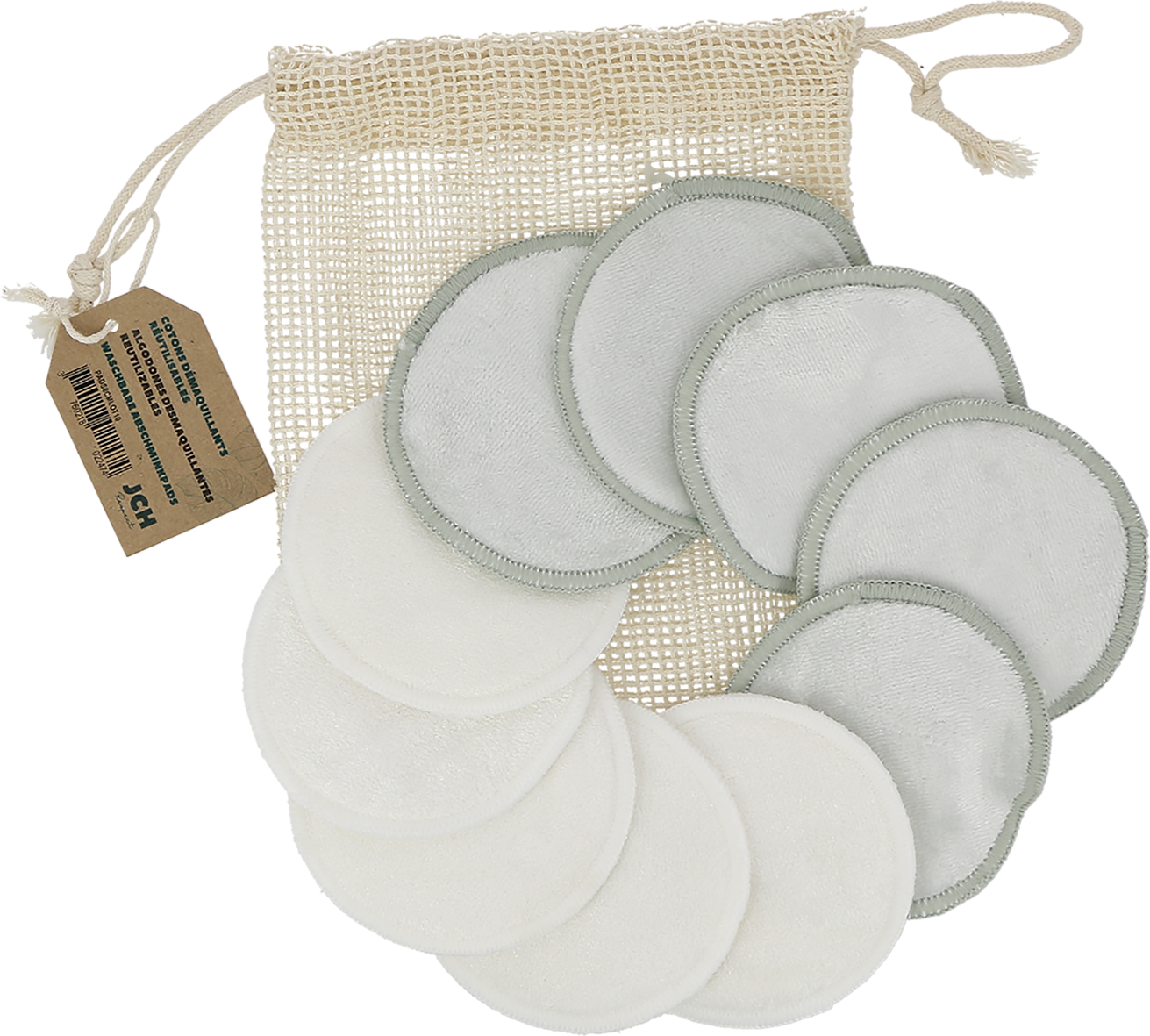 De vaskbare sminkefjerningspadene fra JCH er ekstra skånsomme mot huden og sparer utallige bomullspinner. Settet inkluderer et vaskenett og to typer pads: