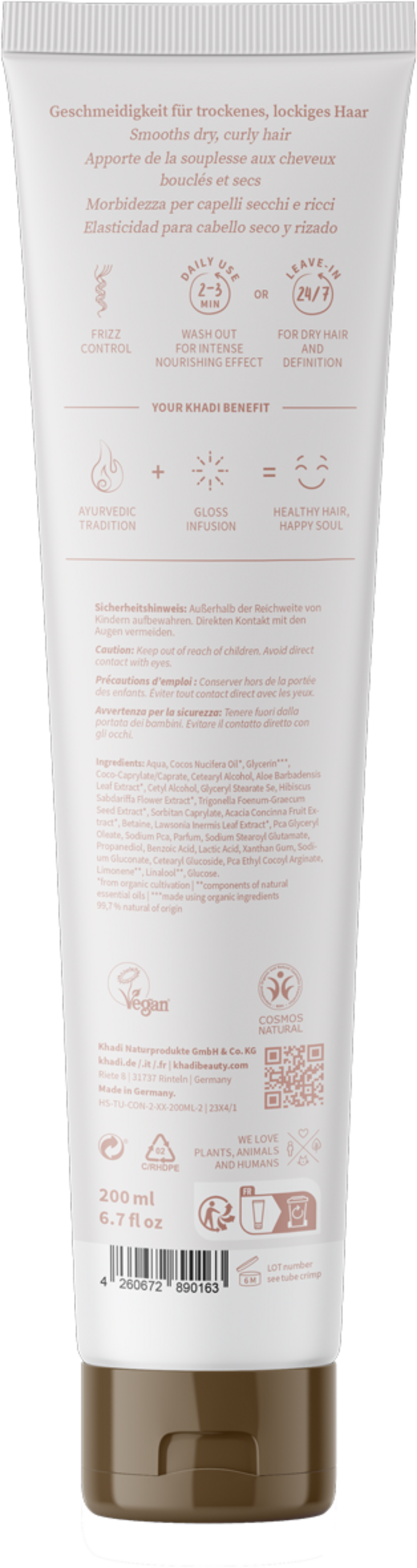 Denne ayurvediske intensivpleien kombinerer de glansfremmende egenskapene til Shikakai med den nærende khadi urt-eliksiren. Formelen omslutter hårstrået og glatter ut hårstrukturen. Kokos gir ytterligere nærende pleie og ekstra glans. Dette motvirker også flisete tupper, forbedrer grebarheten, og gjenstridige krøller får mer definisjon.