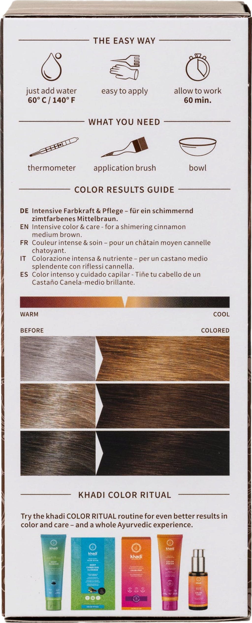Fargen khadi mellombrun gir håret ditt en naturlig, kanelbrun nyanse. Den individuelle fargen avhenger av hårets opprinnelige farge. Nyanser kan variere fra en livlig, varm kanelbrun til en dyp mellombrun. Den 100 % veganske formelen tilfører glans, spenst og et uimotståelig volum til håret ditt.