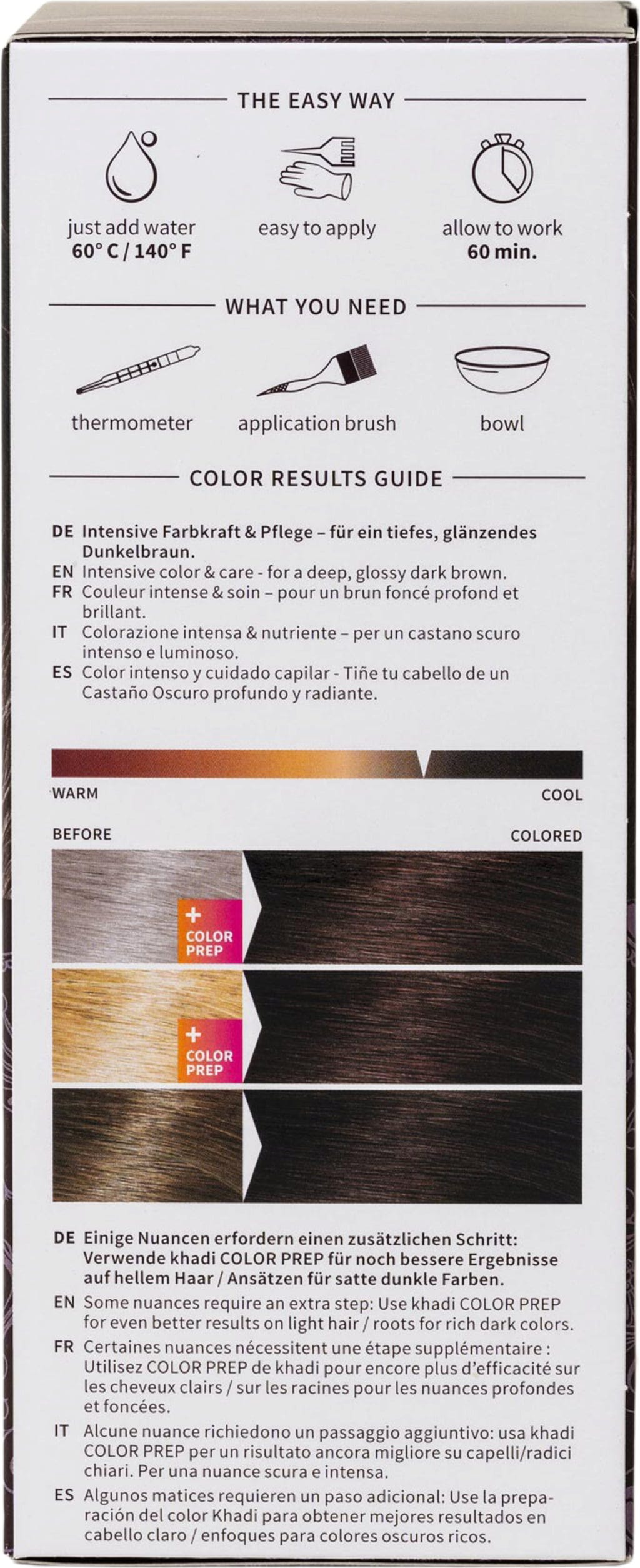 Denne khadi plantebaserte hårfargen farger håret mørkebrunt. Den nye hårfargen påvirkes av din naturlige hårfarge. Fint hår blir mer intenst farget enn tykt hår, og behandlingstiden øker intensiteten. Samtidig sikrer den ayurvediske blandingen av planter både glans og volum.