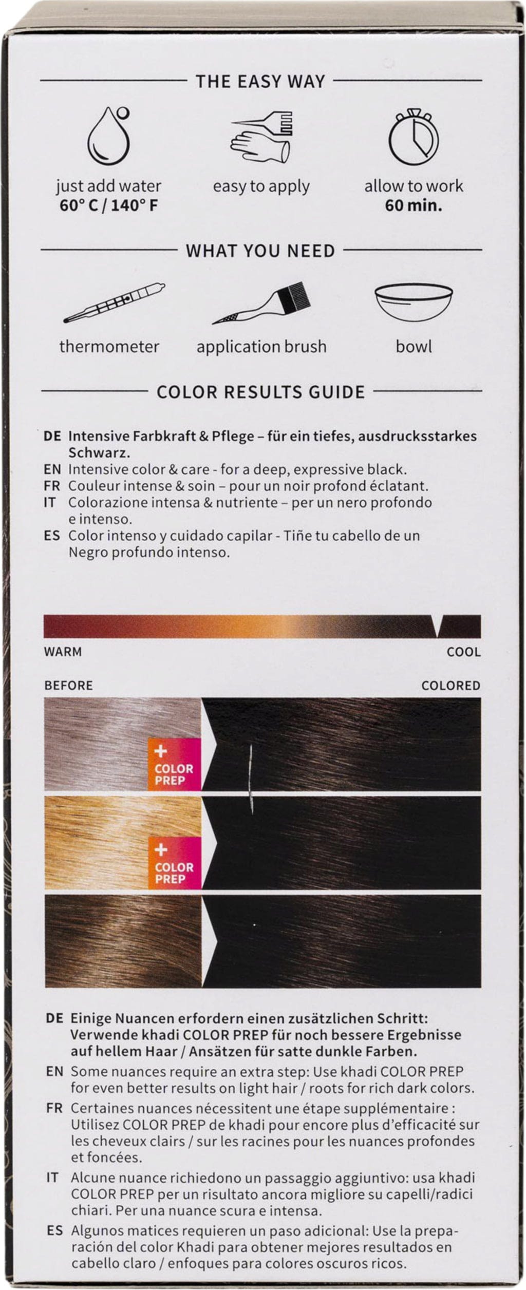 Denne Khadi plantehårfargen farger håret svart. Den nye hårfargen bestemmes av din naturlige hårfarge. Denne plantehårfargen inneholder indigo. Tynt hår blir mer intenst farget enn kraftig hår, og også virketiden øker intensiteten. Gir håret volum og glans.