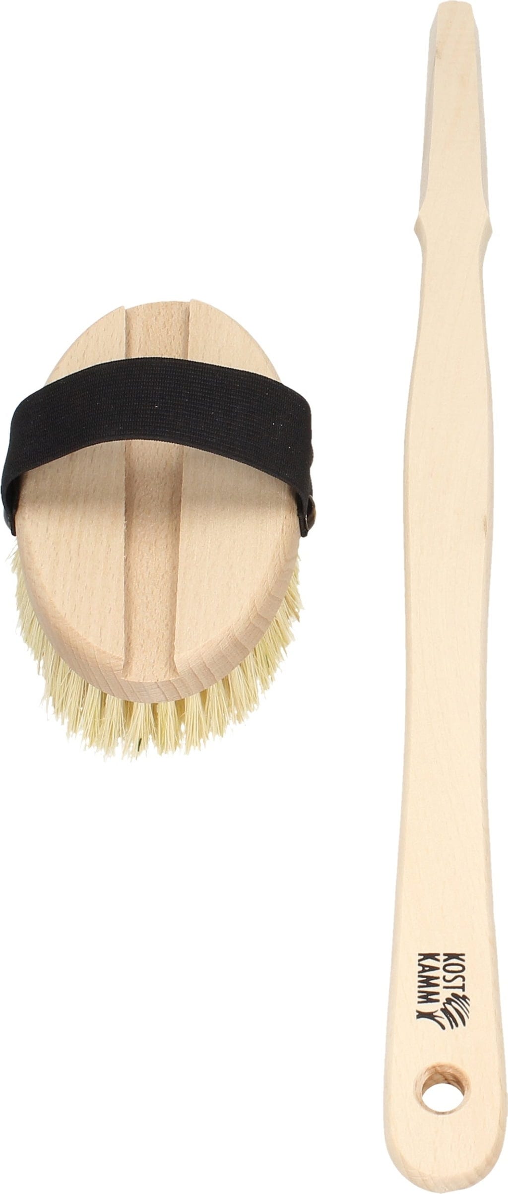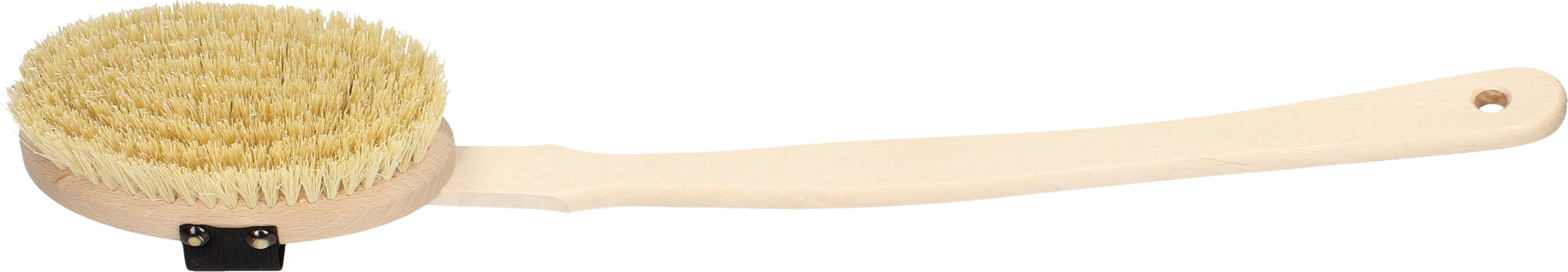 Denne badebørsten av bøk er ideell for intensiv tørrmassasje. Den er også utmerket for bruk i badstue og badekar. Utstyrt med stiv fiber (agaveplantefiber) og har et avtakbart håndtak.