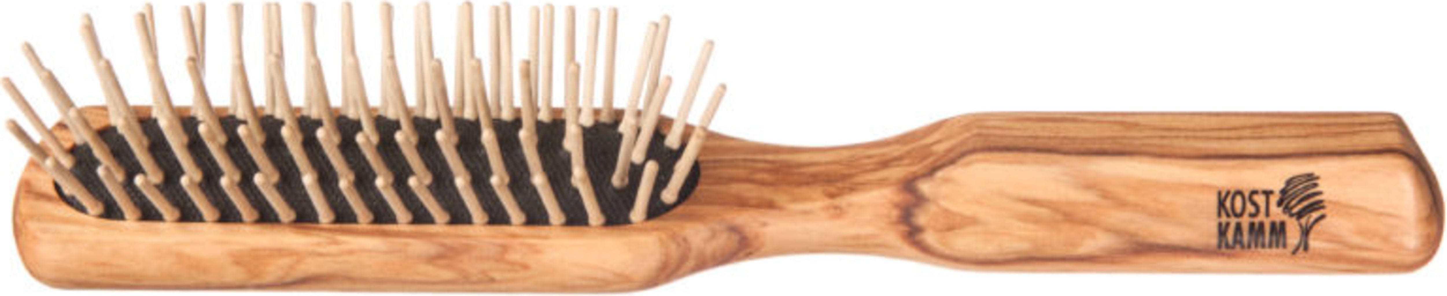 Med børsten av høykvalitets olivenrøtt kan du lett gre og pleie langt, glatt eller bølget hår. Takket være de rette treknoppene har trehårbørsten en intensiv massasjeeffekt på hodebunnen, slik at frisyren blir skånsom.