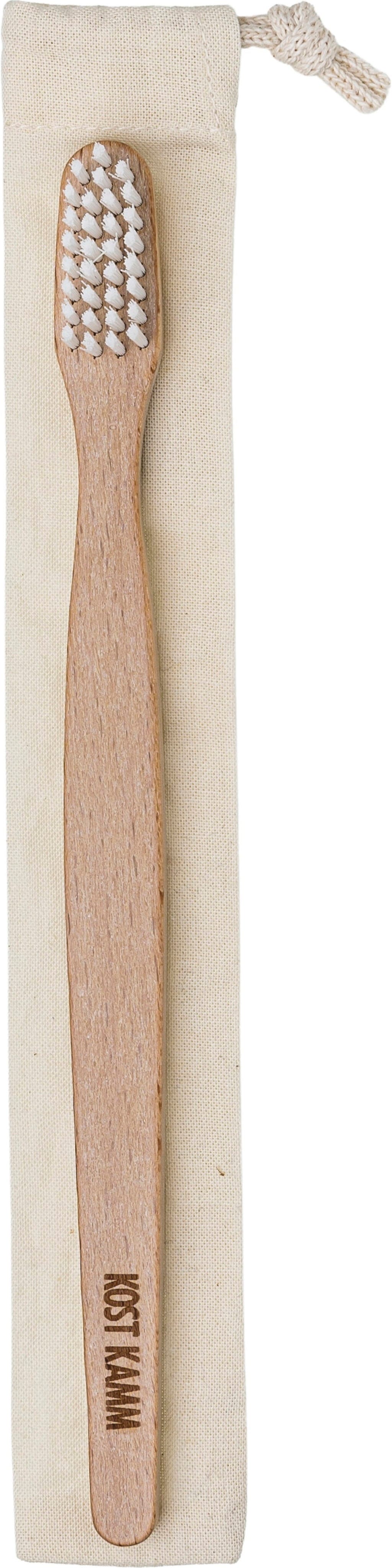 Tannbørsten har et voksbehandlet håndtak i bøketre og veganske børstehoder i kunststoff.