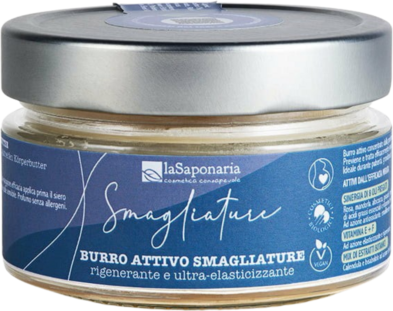 Pleiesmøret fra Smagliature-serien har en myk og fløyelsaktig konsistens som er spesielt behagelig å påføre og massere inn. Den rike og konsentrerte formelen gir dyp næring til huden og bidrar til elastisitet og ny spenst. Dette motvirker at nye strekkmerker oppstår, samtidig som eksisterende - enten de er nye, røde striper eller eldre, hvite striper - pleies optimalt. Smøret er ideelt som pleie i vekstfaser, som pubertet, under graviditet og ved vektsvingninger. Takket være formuleringen med vitaminene E og F, en blanding av planteekstrakter og en synergi av åtte verdifulle planteoljer, fremmer pleiesmøret cellefornyelsen, støtter hudens egen kollagensyntese, og har en toniserende samt elastisitetsfremmende effekt.