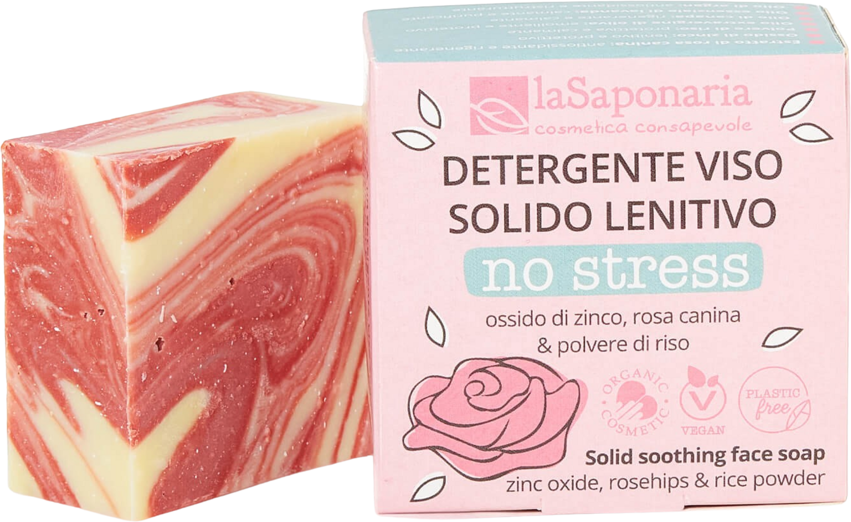 No Stress ansiktsrens er plastfri og kommer i fast form. Den er spesielt utviklet for sensitiv og tørr hud, og renser huden med sin myke krem samtidig som den beskytter og gir fuktighet. Formelen er rik på aktive ingredienser: Sinkoksid og rispulver har beroligende egenskaper og pleier spesielt rød og irritert hud, hampolje beskytter mot uttørking, og nypeekstrakt har en antioksidant effekt.