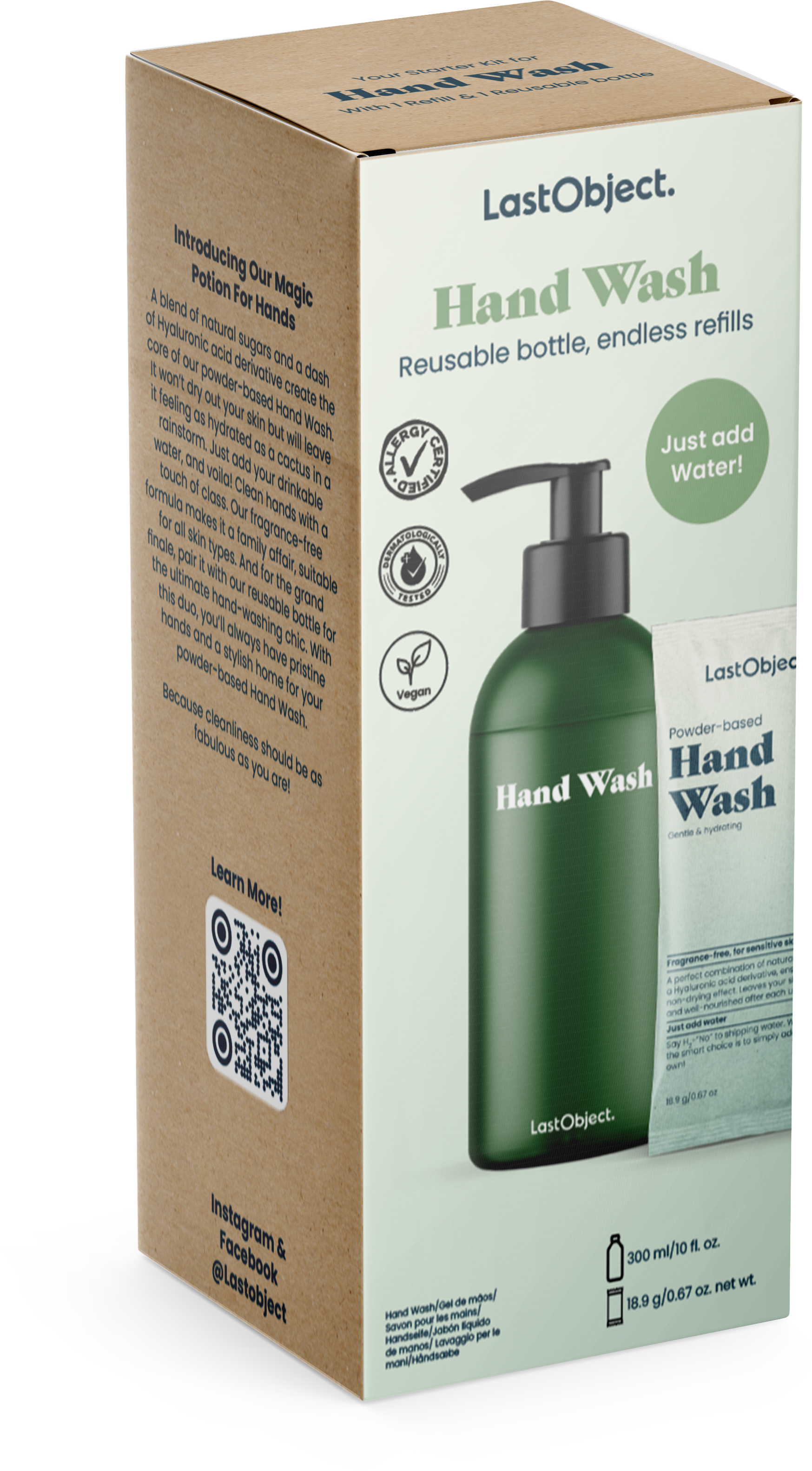Håndvasken er utviklet i samarbeid med skjønnhetseksperten Salli Villefrance, og er fullpakket med nærende og fuktighetsgivende ingredienser som hyaluronsyre og trehalose. Pulverformen reduserer behovet for unødvendig emballasje og vekt under transport. Når såpen er brukt opp, kan dispenseren enkelt fylles opp igjen med en refill.
