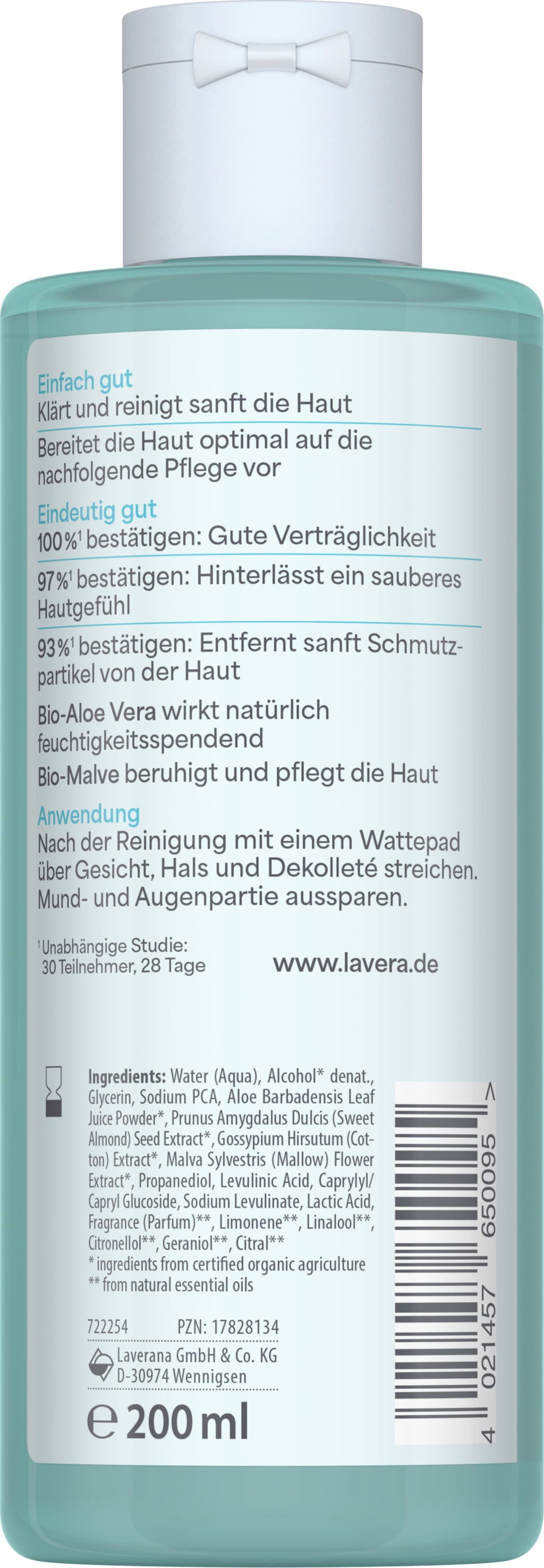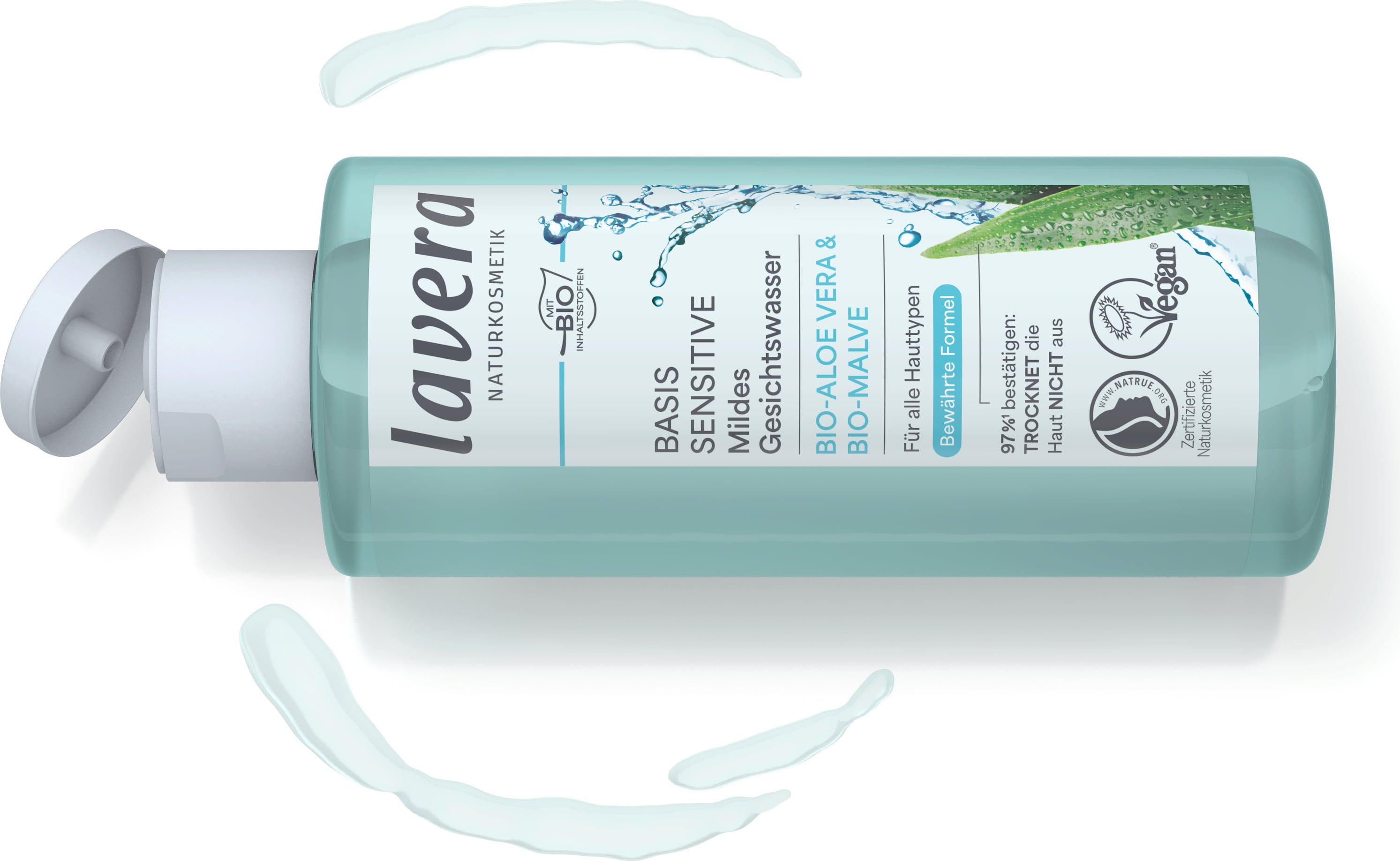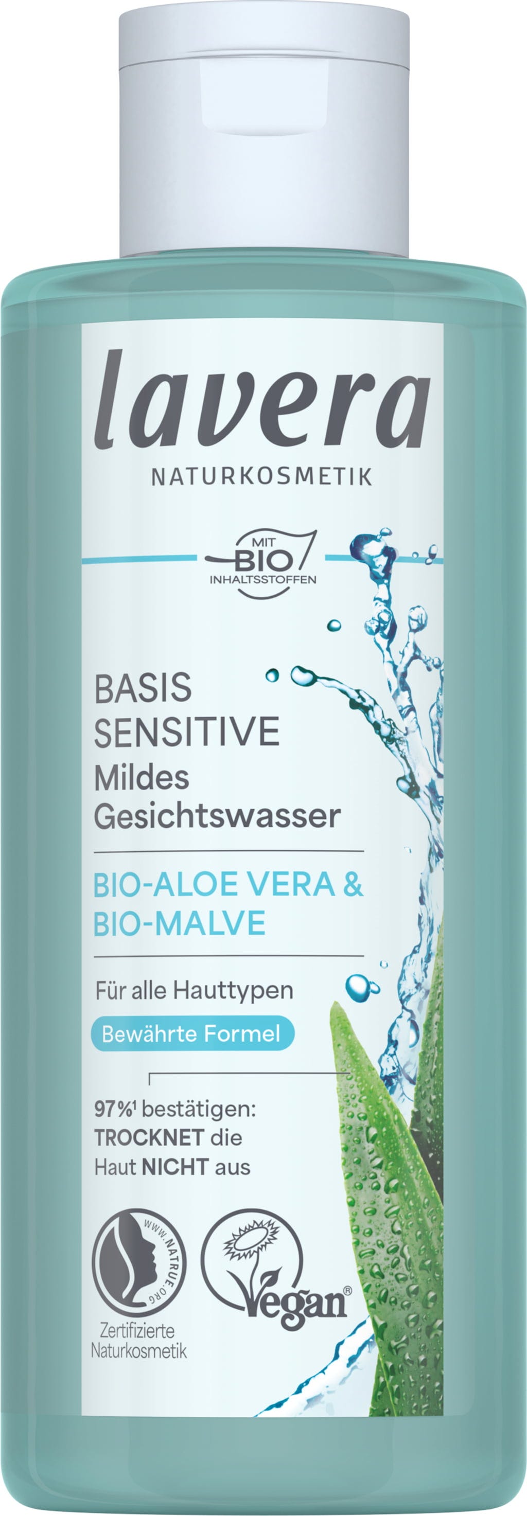 Ansiktsvannet fra lavera gir rikelig med fuktighet takket være innholdet av økologisk aloe vera, mens økologisk rødkløver forbedrer hudens utseende og gir en frisk hudtone. Takket være de milde egenskapene er det også ideelt for sensitiv hud.