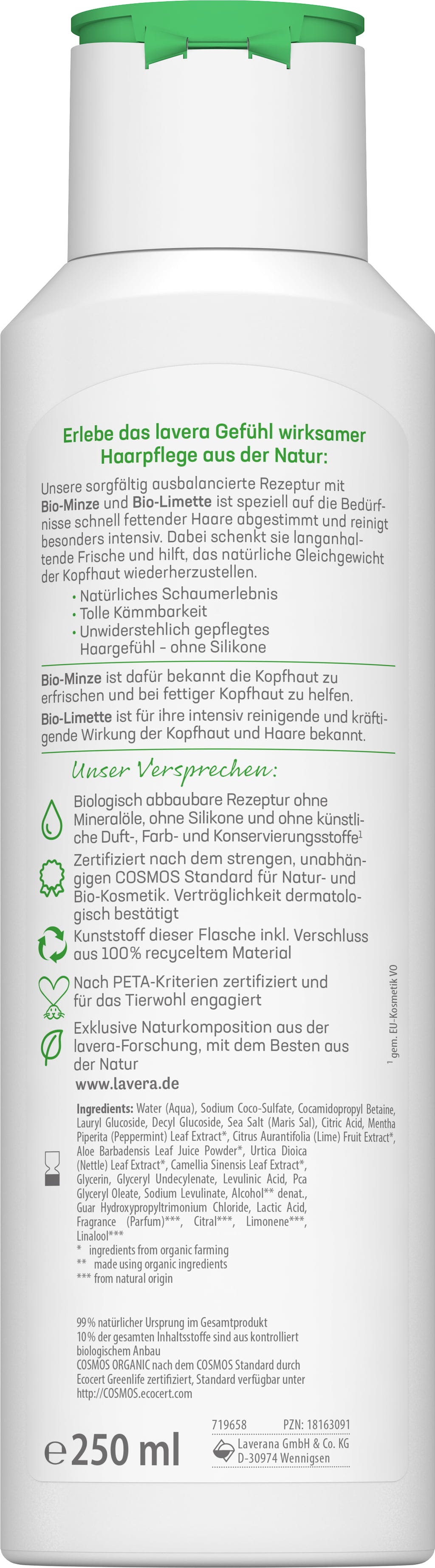 Takket være den forfriskende og balanserte formuleringen, med ekstrakter fra økologisk mynte og lime, renser pleieshampooen fra lavera raskt fet hår på en skånsom måte og balanserer hodebunnen. Den myke teksturen danner sammen med vann et bløtt skum som kan masseres godt inn i håret. Den milde formelen forbedrer kambarheten på manken din og etterlater en uimotståelig følelse av friskhet.