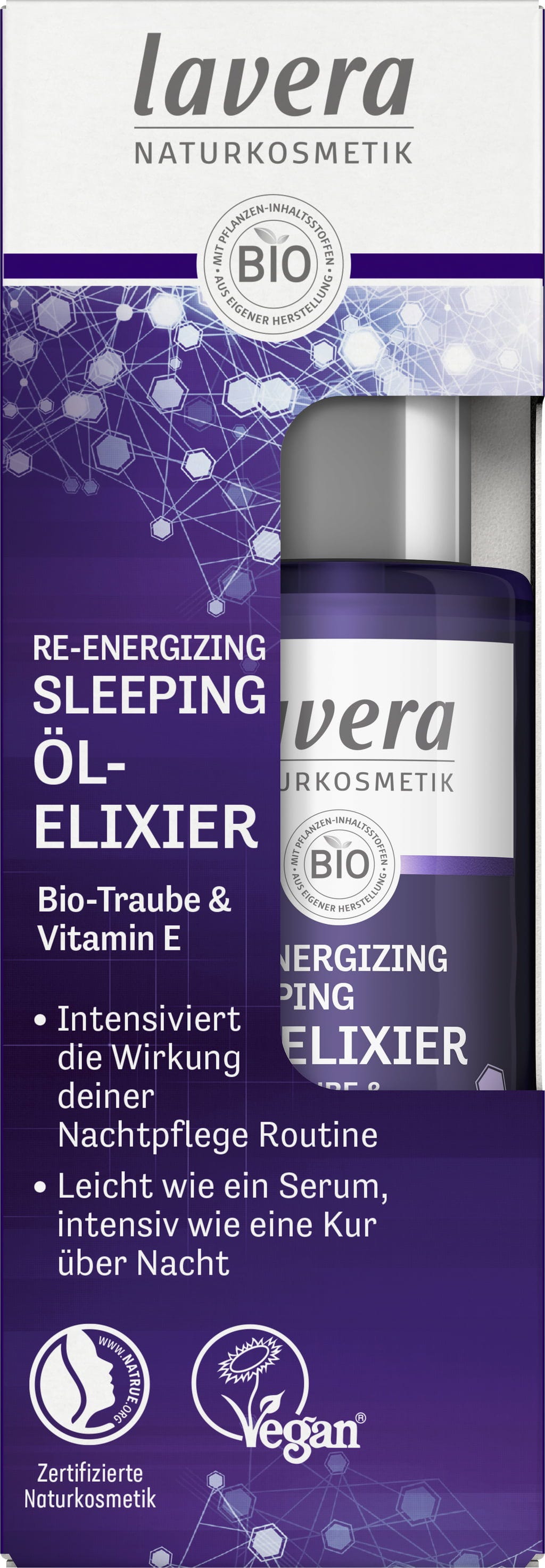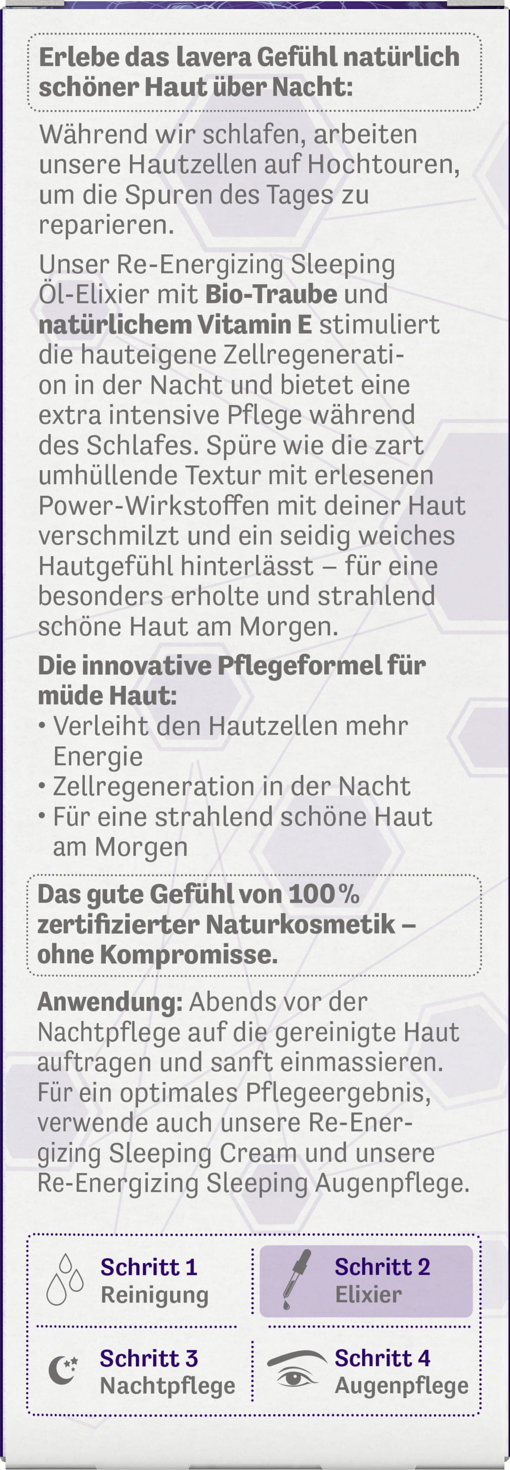 Re-energiserende nattolje-eliksir fra lavera stimulerer hudens naturlige cellefornyelse om natten, slik at du våkner uthvilt og strålende om morgenen. Den delikate teksturen fungerer som et lett serum og legger seg som et fint lag over huden. Beriket med antioksidantrik druekjærneolje og vitamin E, trenger den næringsrike formuleringen dypt inn i huden og fremhever dens naturlige skjønnhet.