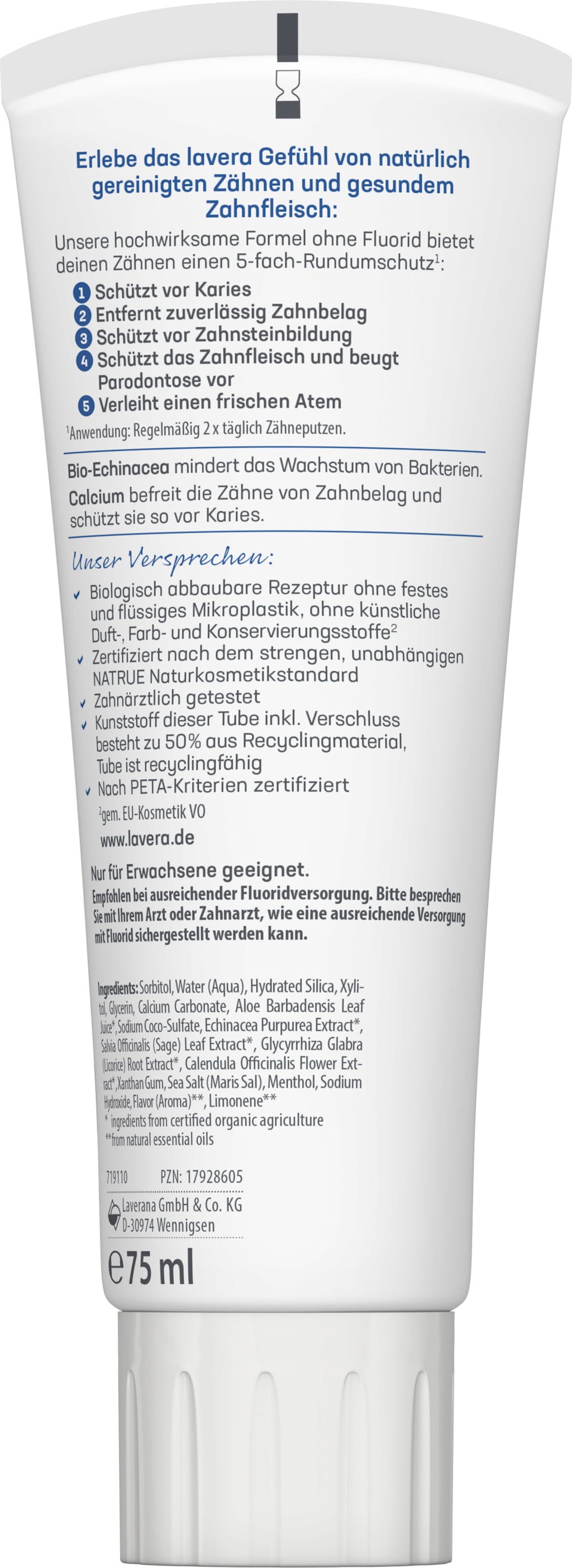 Med en svært spesiell sammensetning basert på kalsium og økologisk echinacea, sikrer denne tannkremen en effektiv munnhygiene, helt uten fluorider. Takket være dens 5-fasettede fullstendige beskyttelse fjerner den tannplakk, beskytter tennene mot karies og tannstein og gir samtidig frisk pust. Tannkjøttet blir også skånsomt pleiet.