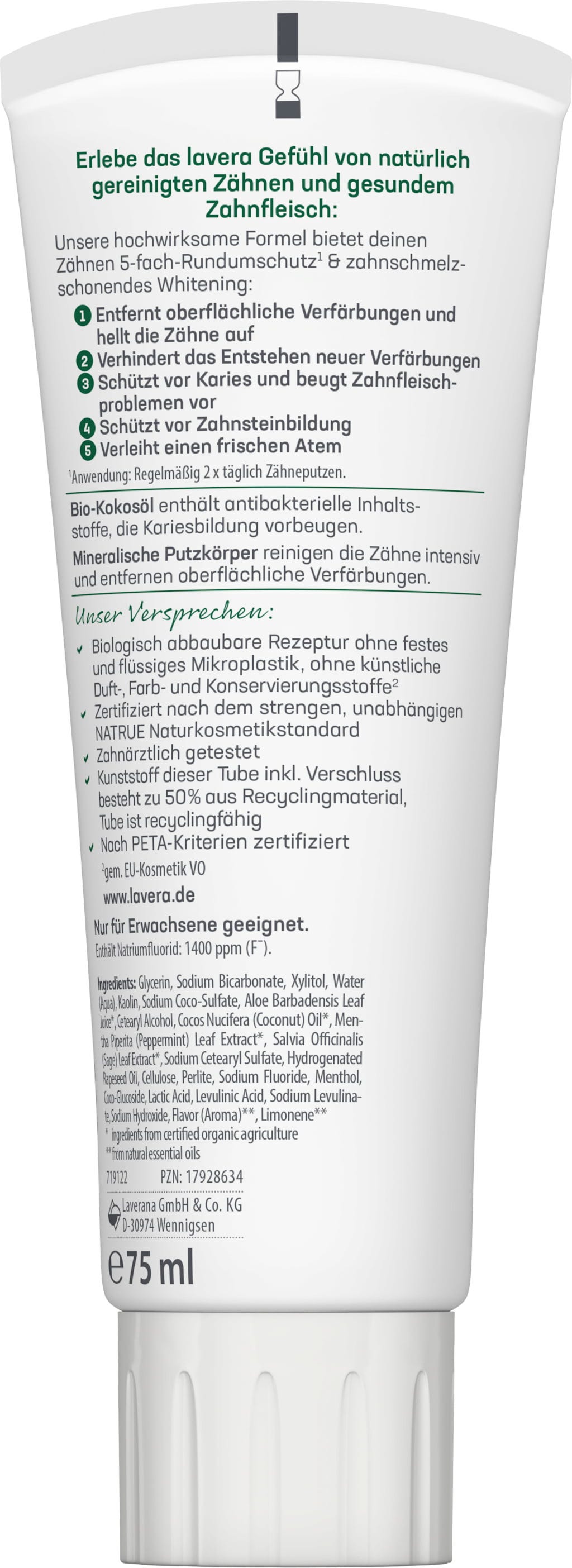 Glycerin, Sodium Bicarbonate, Xylit, Aqua, Caolin Clay, Sodium Coco Sulfate, Aloe Barbadensis Leaf Juice[1], Cetearylalcohol, Cocos Nucifera (Coconut) Oil[1], Mentha Piperita Leaf Extract[1], Salvia Officinalis (Sage) Leaf Extract[1], Sodium Cetearyl Sulfate, Hydrogenated Rapeseed Oil, Cellulose, Perlite, Sodium Fluoride, Menthol, Coco Glucoside, Lactic Acid, Levulinic Acid, Sodium Levulinate, Sodium Hydroxyde, Aroma[2], Limonene[2]
