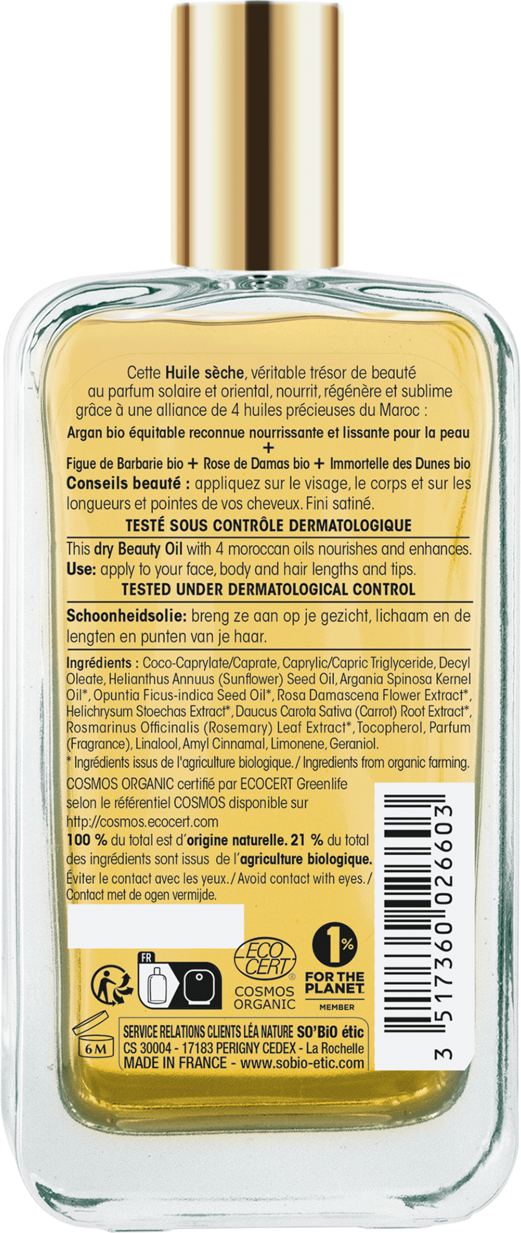 Denne allsidige tørroljen er en ekte skjønnhetsskatte, den nærer, regenererer og foredler takket være sin kombinasjon av fire marokkanske oljer. Den fine økologiske blandingen av argan, kaktusfiken, damaskrose og immortelle des Dunes gir også en glatteffekt på hud og hår og etterlater en solfylt, orientalsk duft.