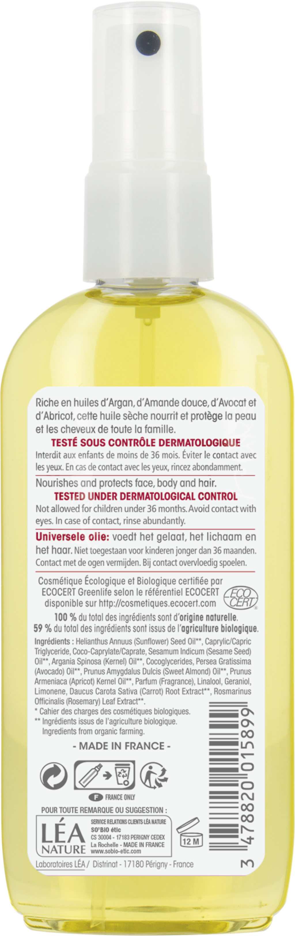 Denne fantastiske oljen inneholder ikke bare en høy andel av arganolje, men også oljer fra søtmandel, avokado og aprikos. Den tørre teksturen gir næring i dybden på en naturlig måte og beskytter huden til hele familien. Den fremmer den naturlige skjønnheten i ansiktet, kroppen og håret.