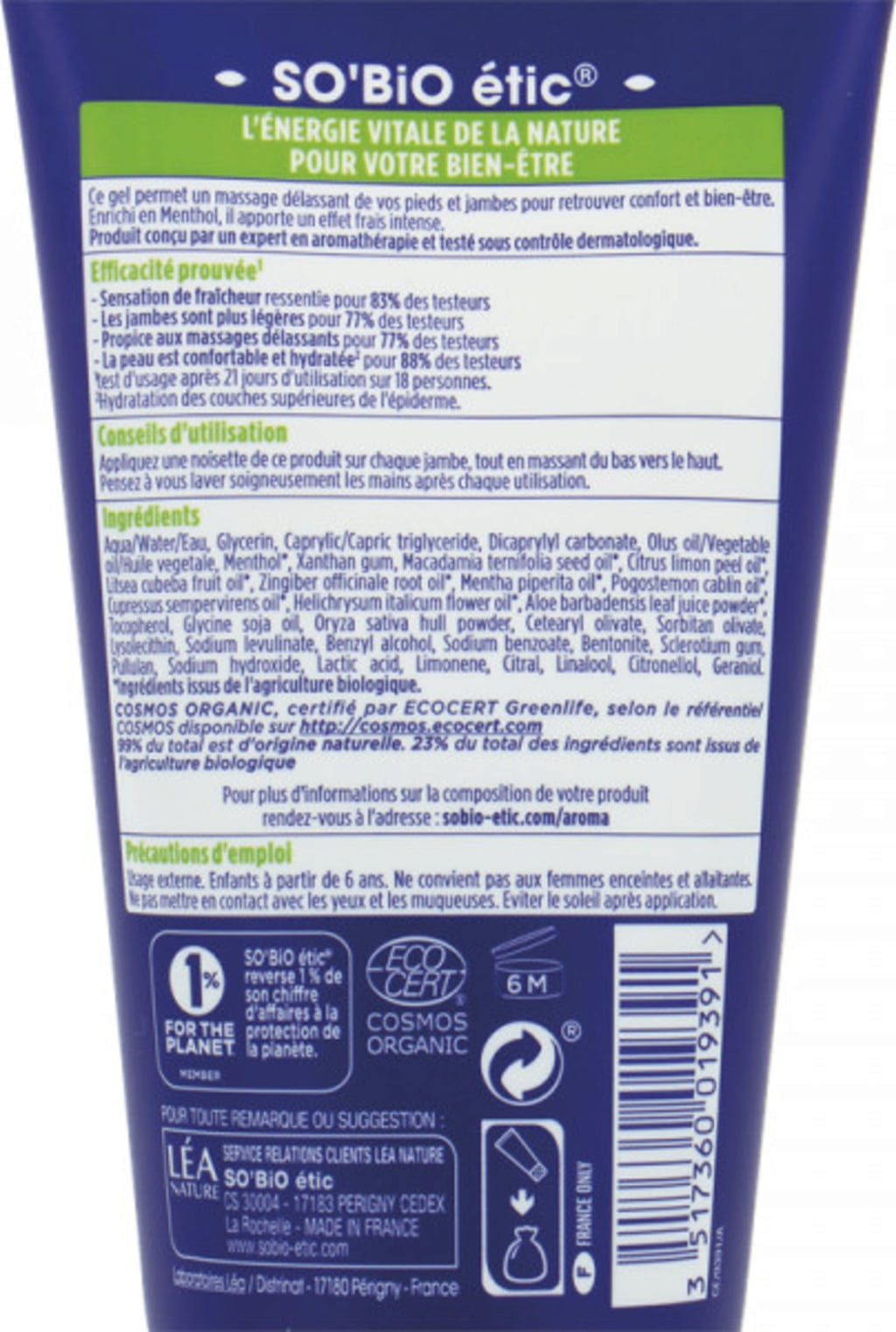 Med syv eteriske oljer formulert av en ekspert i aromaterapi, er det ideelt for massasjer av beina. Takket være mentol virker dette geléet kjølende og gir forfriskning etter en lang dag.