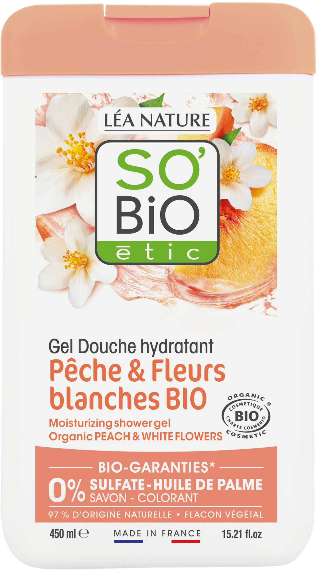 LÉA NATURE SO BiO étic Fuktighetsgivende dusjgelé med fersken og hvite blomster, 450 ml