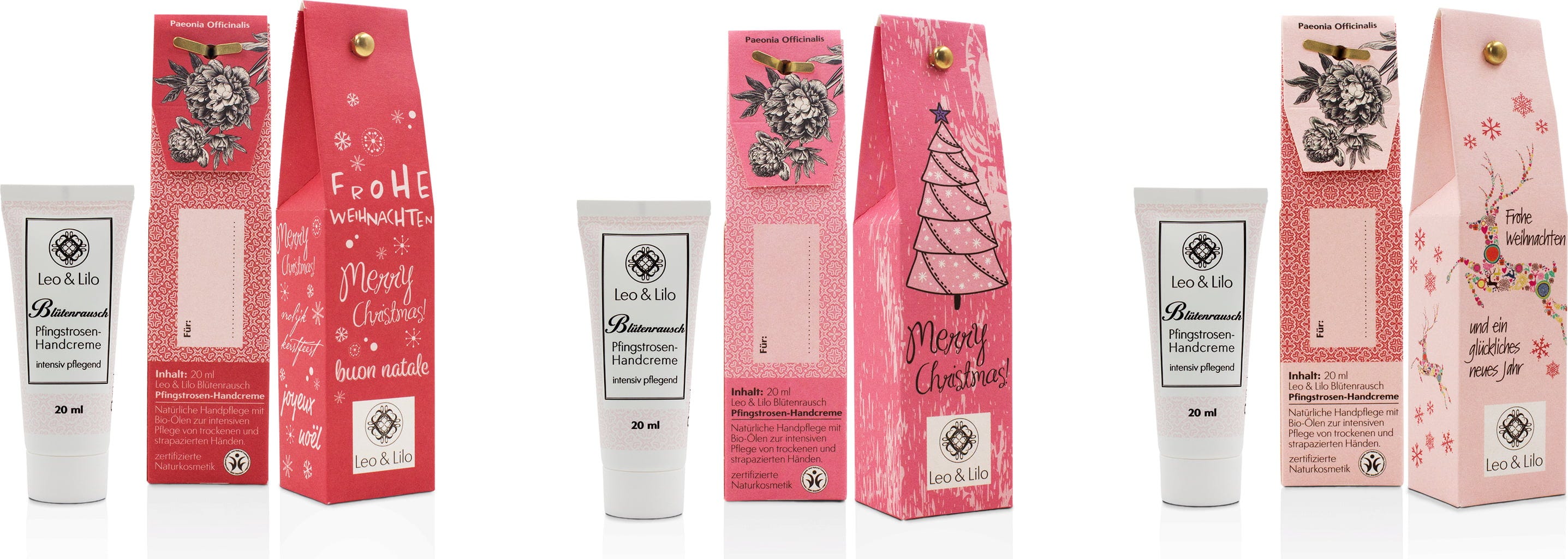 Ønsk dine kjære en vidunderlig juletid med X-Mas-hilsener fra Leo & Lilo. Hver lille gave inneholder den herlig duftende peon-håndkremen og kommer med et vakkert julemotiv.