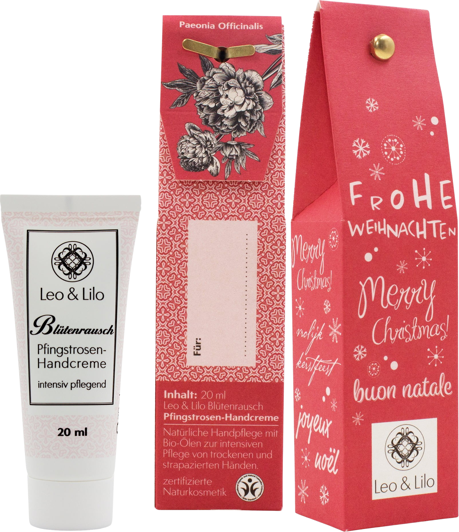 Ønsk dine kjære en vidunderlig juletid med X-Mas-hilsener fra Leo & Lilo. Hver lille gave inneholder den herlig duftende peon-håndkremen og kommer med et vakkert julemotiv.