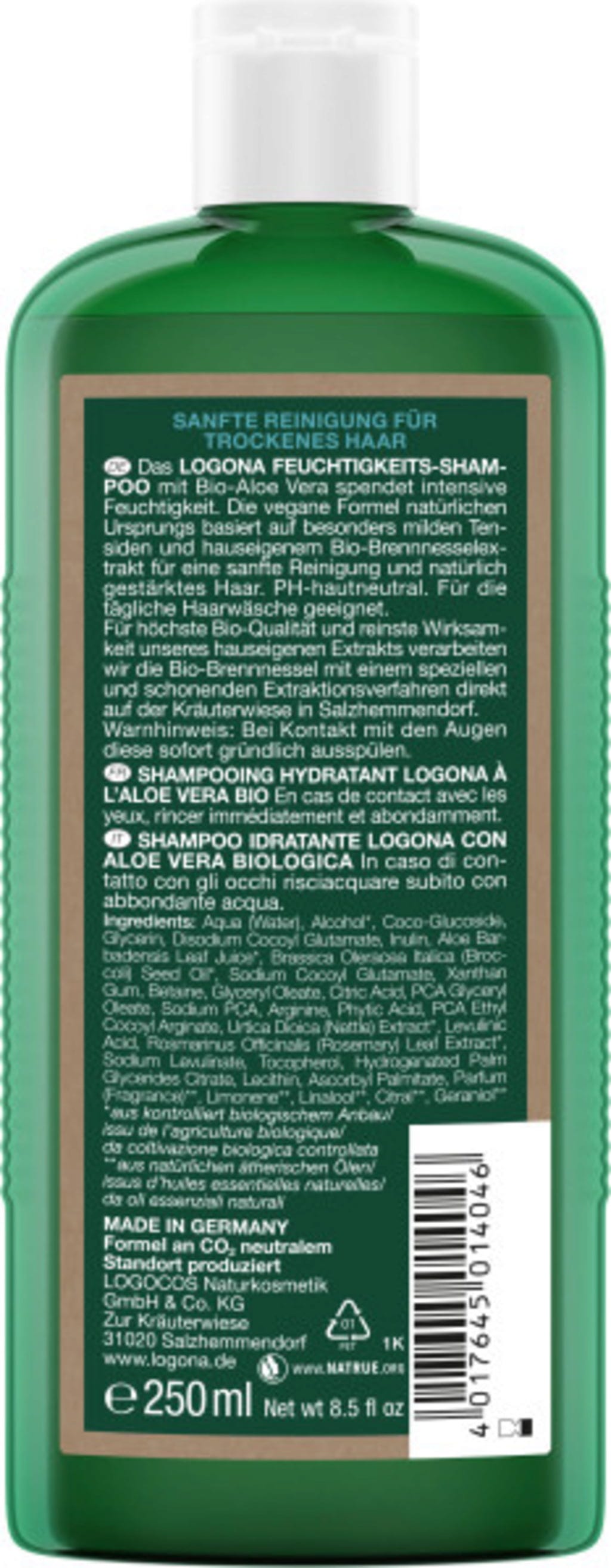 LOGONA Fuktighetsgivende Sjampo med Økologisk Aloe Vera er spesielt utviklet for behovene til tørt, skadet hår og sensitiv hodebunn. Den naturlige fuktighetsformelen med økologisk aloe vera, hyaluronsyre, og naturlig betain gir fuktighet, beskytter håret mot uttørking og etterlater det silkemykt. Mildt vaskeaktive stoffer rengjør hår og hodebunn grundig.
