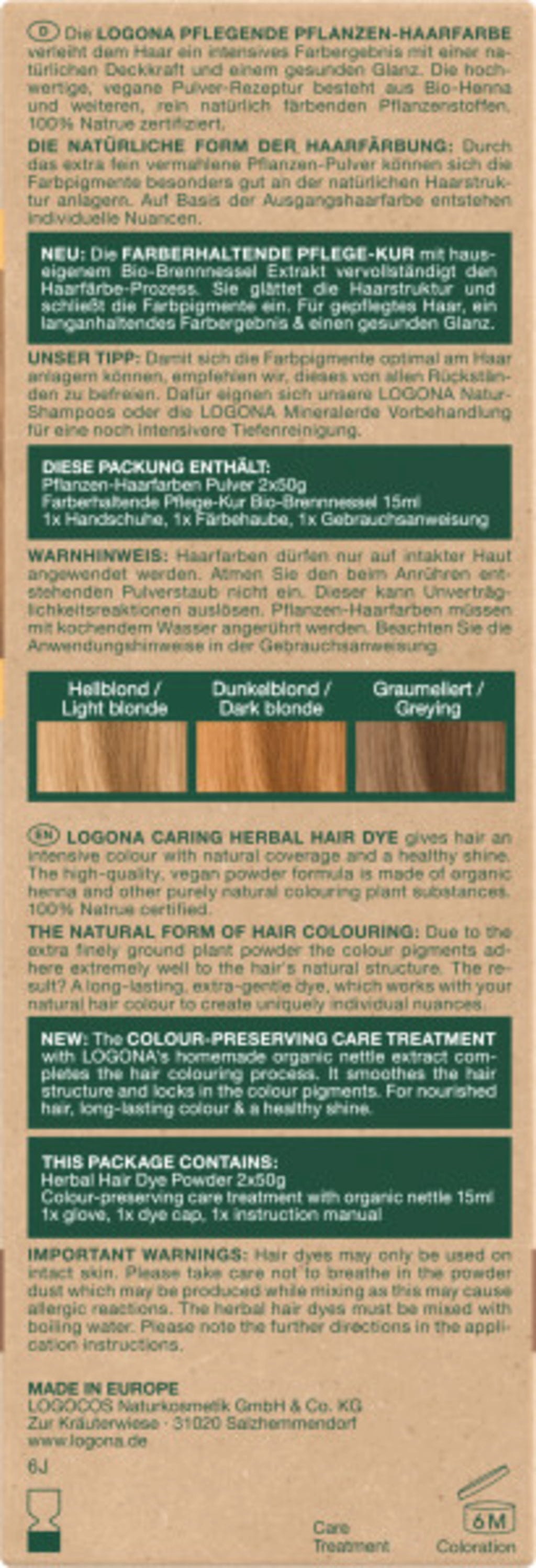 Nyanser av Kobberblond er særlig anbefalt for lys- til mørkblondt hår. Logona Plantebaserte Hårfarger er spesielt skånsomme og farger håret ditt mer forsiktig enn kjemiske hårfarger. De angriper ikke direkte hårstrukturen, men legger seg beskyttende rundt håret. Hver plantebaserte hårfarge sørger med en oppskrift av henna, urter og frukt for intensiv lysstyrke, mer glans og naturlig volum. Den inkluderte fargebevarende hårkuren med økologisk brennesle, fullfører fargeprosessen. Den glatter håret og forsegler fargepigmentene slik at fargen varer lenger.