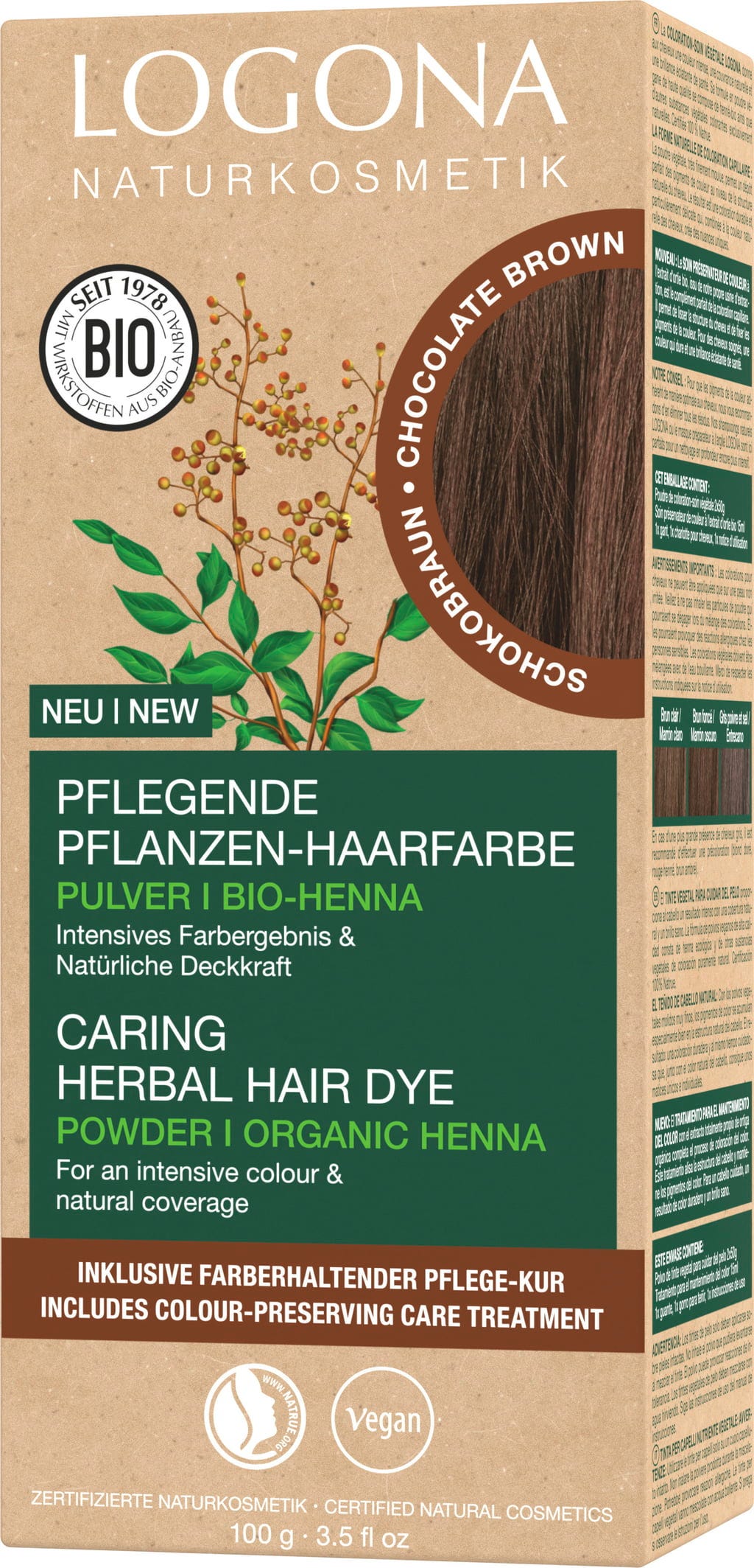 Nyanse sjokoladebrun gir best resultater på lys blondt til mørkebrunt hår. Logona plantehårfarger er særlig skånsomme og farger håret mer forsiktig enn kjemiske hårfarger, da de ikke angriper hårstrukturen direkte, men legger seg beskyttende rundt håret. Blandingen av henna, urter og planteekstrakter gir intens lysstyrke, glans og voluminøst hår. Den inkluderte fargebevarende behandlingen med økologisk brennesle kompletterer fargeprosessen. Den glatter ut håret og kapsler inn fargepigmentene slik at fargen varer lenger.