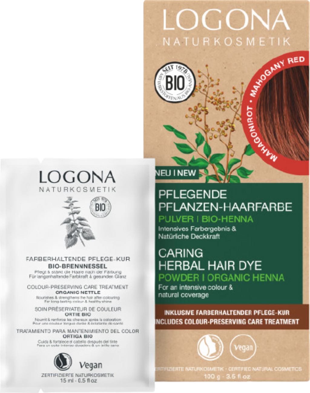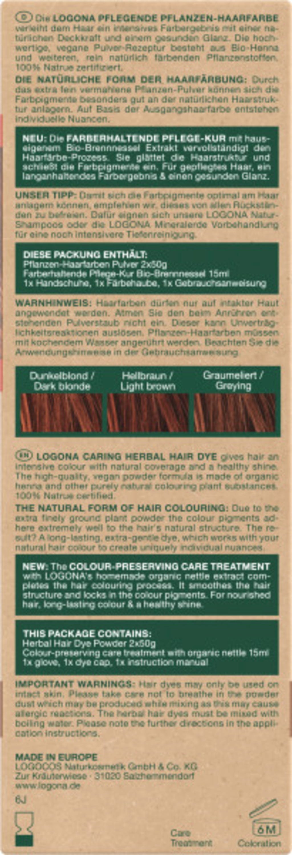 Den vakre mahogni-røde nyansen er spesielt egnet til å farge mørkblondt til mellombrunt hår, og gir det et mykt og naturlig, intensivt skimmer. Logona plantfarger er spesielt skånsomme og farger håret mer mildt enn kjemiske hårfarger. De angriper ikke hårets struktur direkte, men legger seg beskyttende rundt håret. Hver plantebaserte hårfarge gir intens fargedybde, mer glans og naturlig volum takket være en oppskrift med henna, urter og fruktekstrakter.