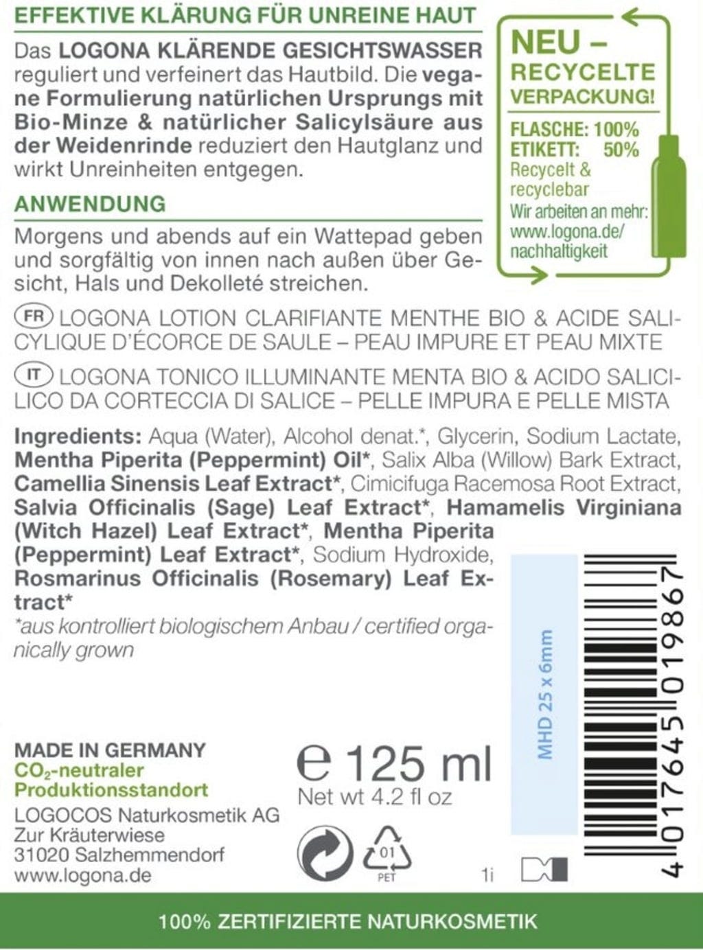 LOGONA purify Rensende ansiktsvann, 125 ml