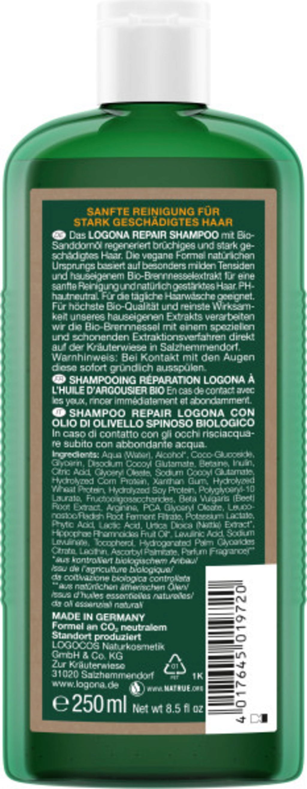 Shampooen fra LOGONA er spesielt utviklet for skadet og sprøtt hår. Den verdifulle kompleksen av planteproteinkilder, milde tensider, og merkets egen økologiske brennesleekstrakt, renser varsomt, mens økologisk tindvedolje gjør hårstrukturen myk og smidig.