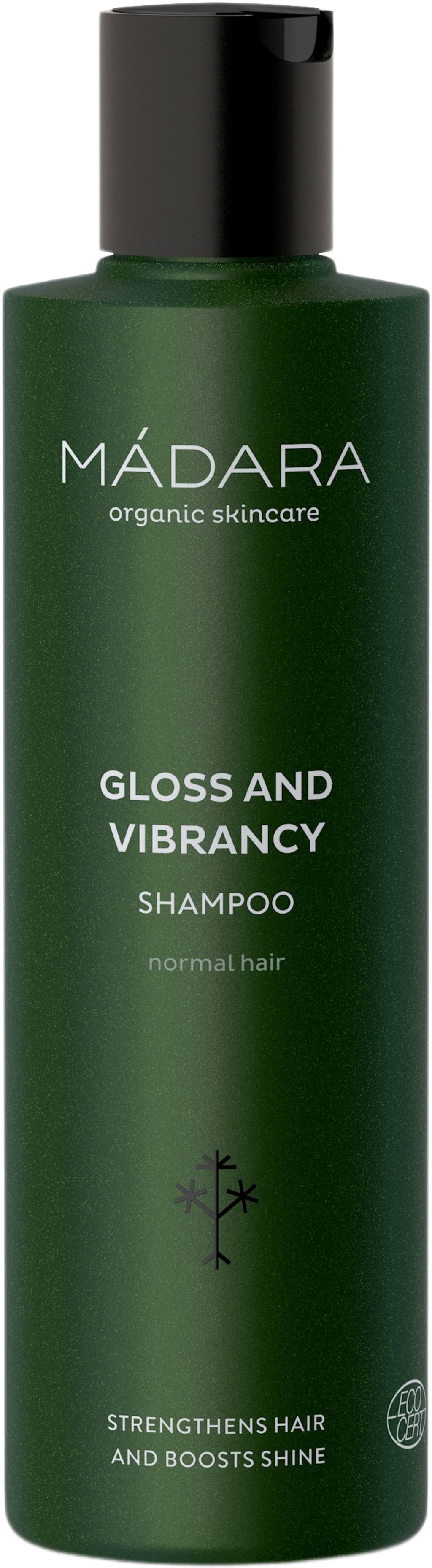 Gloss and Vibrancy Shampoo fra MÁDARA fremmer glans i normalt hår takket være nordisk bjørk og tranebær, gir beskyttende egenskaper og øker fylden mens det renser skånsomt. Håret blir styrket, føles silkemykt og stråler av skjønnhet.