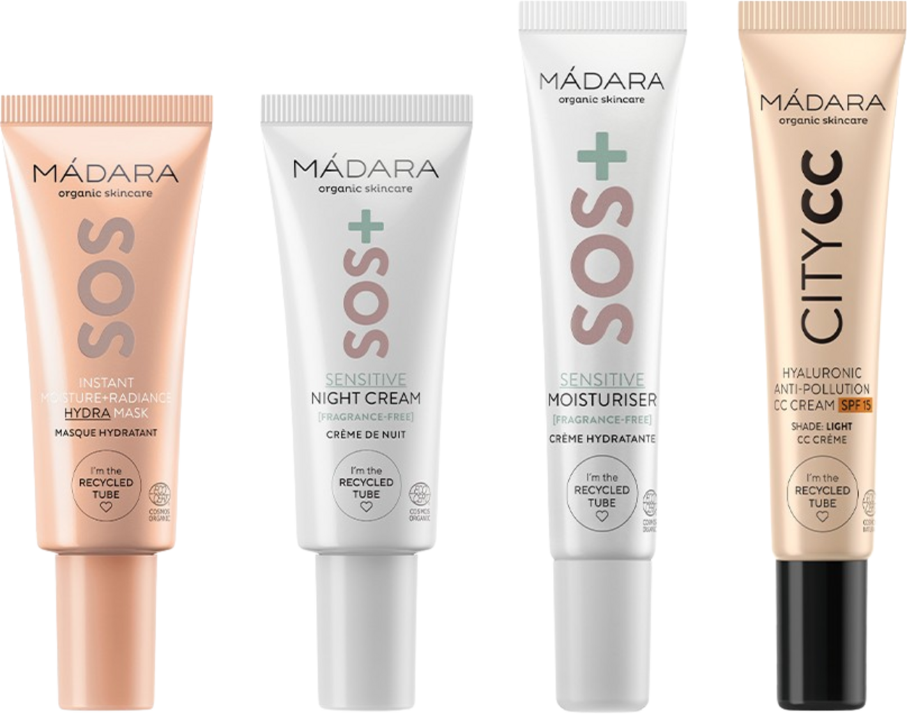 anmeldelser på norsk for MÁDARA Organic Skincare SOS CARE 4-trinns hudberoligende rutine-sett