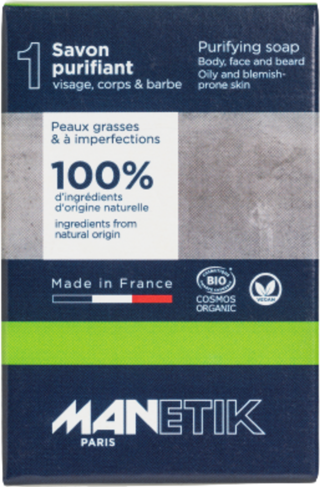 Formulert med baobab, neem, grønn leire samt ricinusolje, er denne såpen spesielt egnet for ung, uren og fet hud hos menn. Den er skånsomt kaldprosesseret og renser uten å tørke ut huden. Formelen virker klargjørende og sebumregulerende, samtidig som den tilfører fuktighet under rensingen. I tillegg gjør den huden og skjegget mykt og smidig.