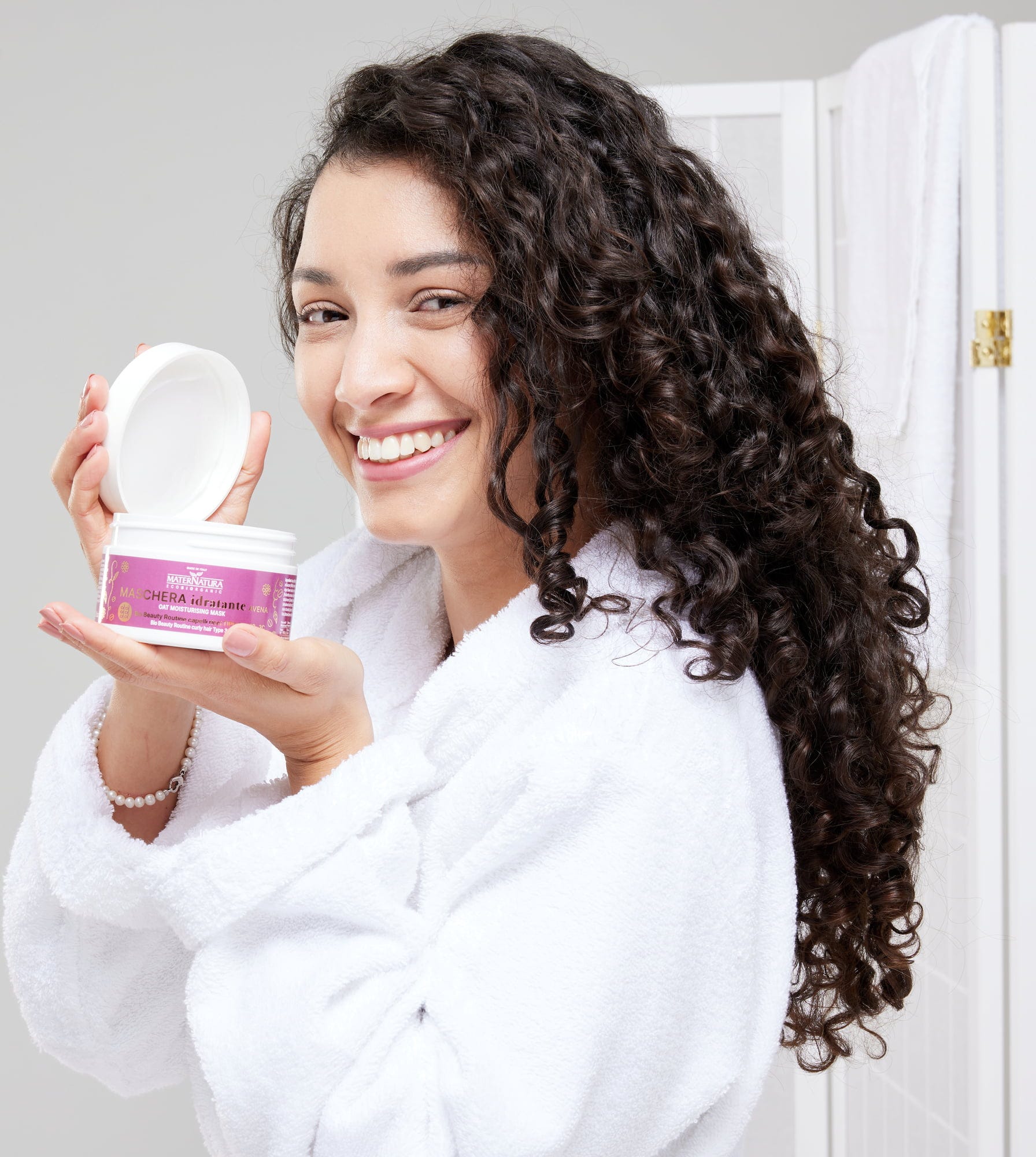 Denne hårmasken er spesielt nærende med tilskudd av verdifulle planteoljer. Ricinus- og linolje gir liv til matt og skadet hår, mens murumurusmør beskytter håret mot skadelige ytre påvirkninger og gjør det elastisk. Det plantebaserte proteinet fra quinoa gjør håret silkeaktig og mykt, og kokosolje bringer det i riktig form, slik at krøller kan komme til sin rett og stråle i sin naturlige skjønnhet.