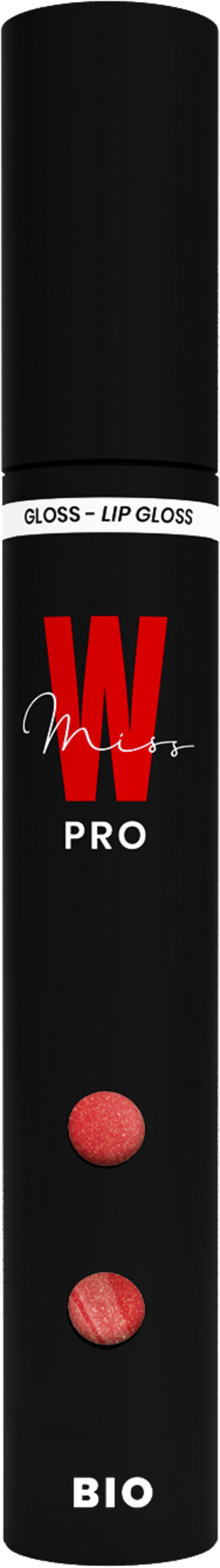 Lipglossen fra Miss W PRO gir glinsende lepper som ser fyldigere ut og gir en Wet-Lips-effekt. De inkluderte pigmentene reflekterer lyset og gir en ekstra skimrende finish. Formuleringen pleier samtidig med økologisk ricinusolje.