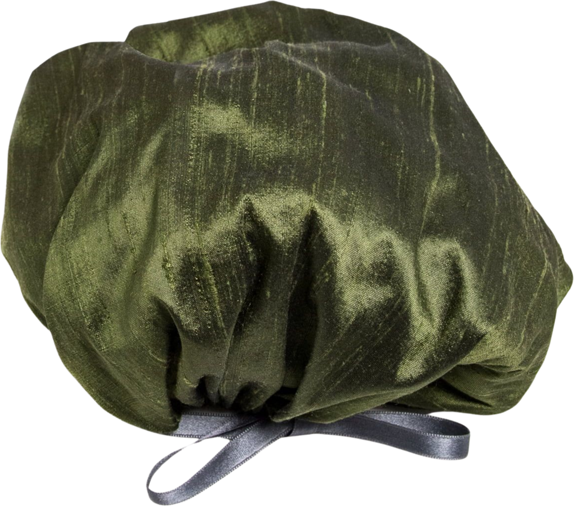 Denne silkehetten holder frisyren gjennom natten. Trekk turbanen over håret før leggetid for å forhindre floker og statisk elektrisitet ved friksjon. Produktet er håndlaget av shantungsilke, et grovt men spesielt verdifullt silkestoff, utvunnet fra såkalte dobbelkokonger.