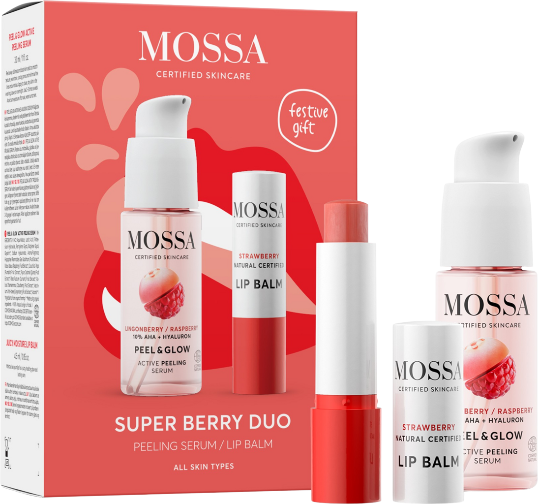Dette settet inneholder to populære hudpleieprodukter fra Mossa. Med det unike Peeling-Serumet og leppebalsam får ansiktet ditt intens pleie. Duoen passer for alle hudtyper og er en utmerket gaveidé for dine kjære.