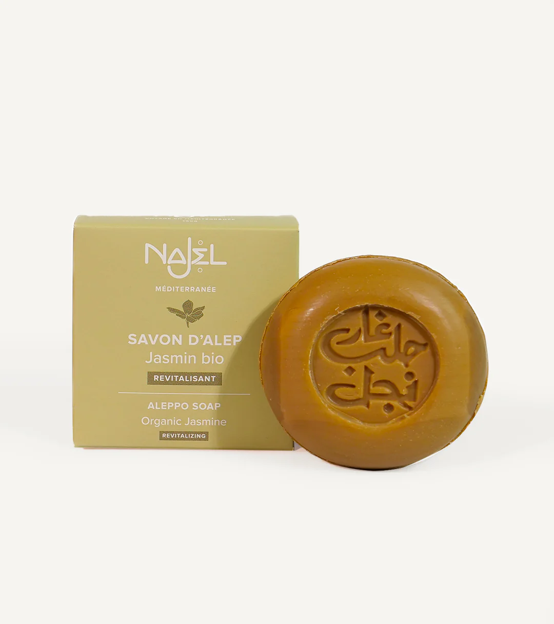 Denne runde Aleppo-såpen fra Najel Collection kombinerer den tradisjonelle kunnskapen om Aleppo-såpeproduksjon med den milde duften av jasmin.