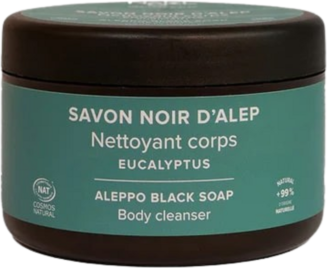 Svarte Aleppo-såpe har en lang tradisjon i orientalske dampbad. Den er hemmeligheten bak strålende og myk hud, og tilbyr som stor fordel de vitaliserende og klargjørende egenskapene til eterisk eukalyptusolje. For optimal hudpleie anbefales en ukentlig peeling.