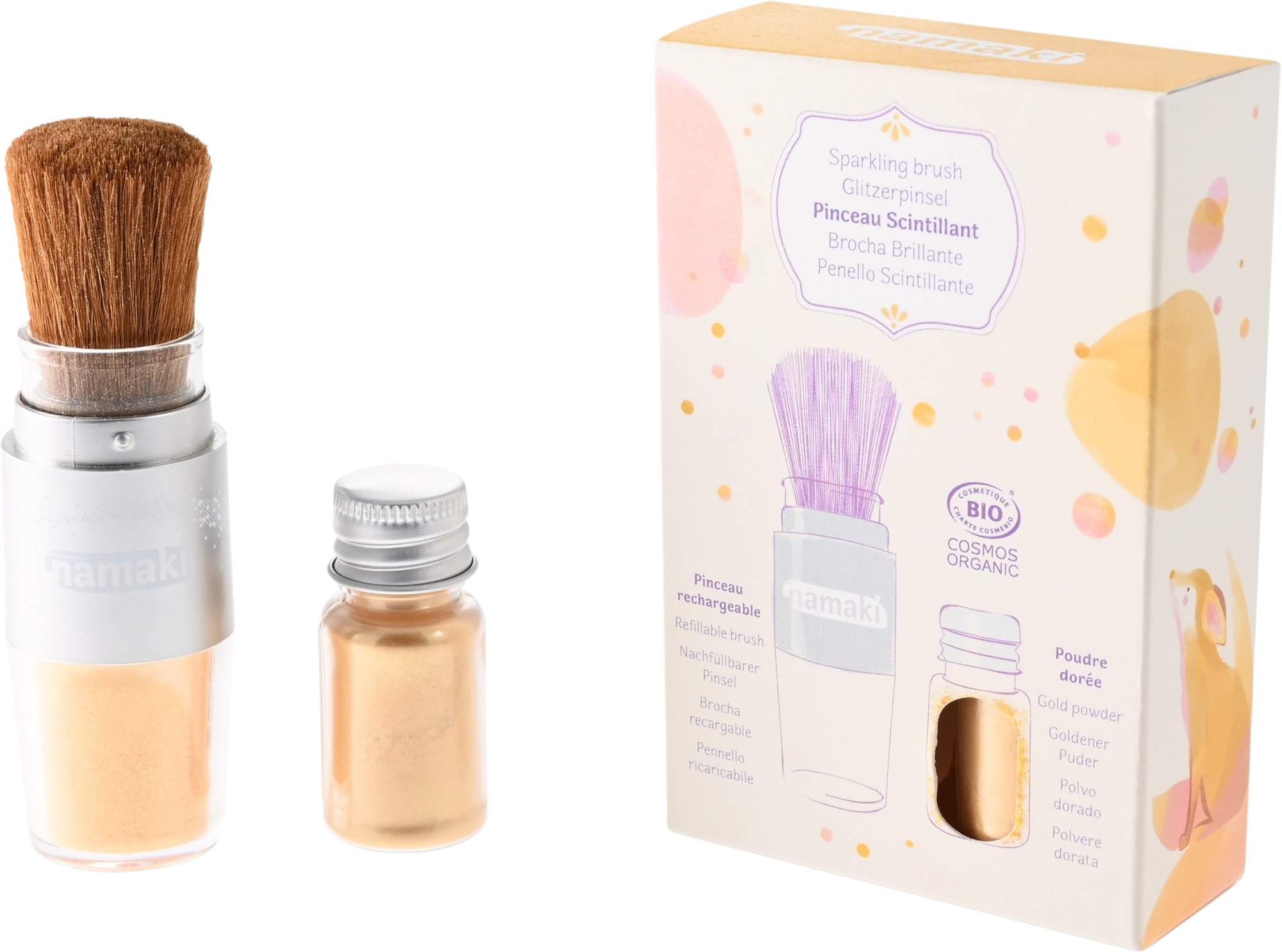 Det gyldne shimmerpudderet fra namaki er 100 % laget av naturlige og mineralske ingredienser. Det er ikke bare spesielt hudvennlig, men også bra for miljøet. Det kan påføres enkelt med Magic Brush og fylles opp uendelig mange ganger. Slik kan små prinsesser og feer glitre fra topp til tå!