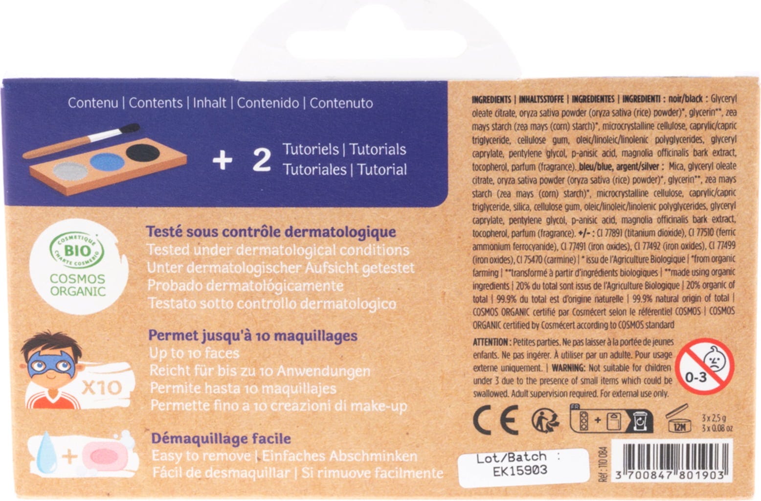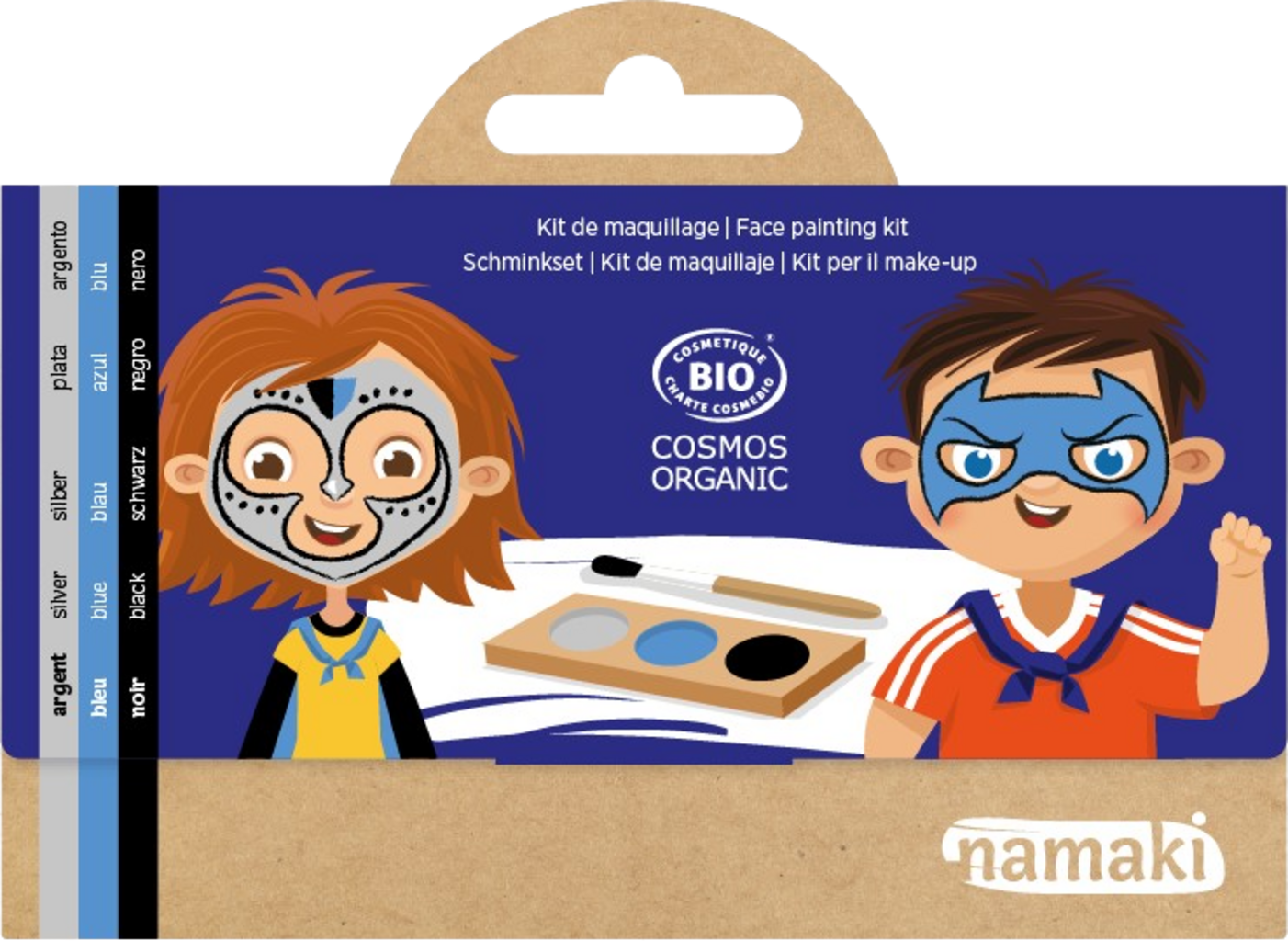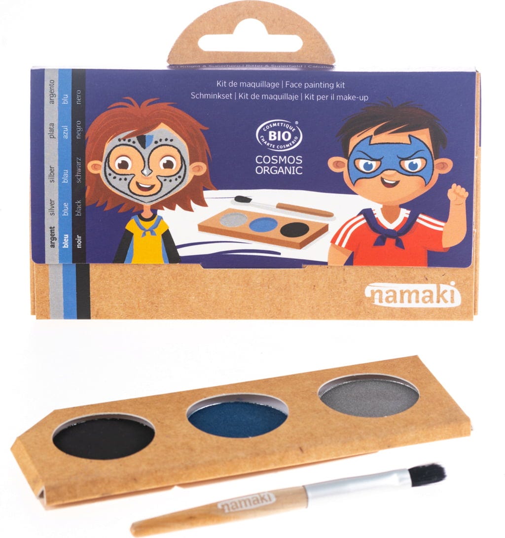 Settet består av en pensel og hudvennlige farger i svart, blått og sølv, som raskt forvandler ethvert barn til en ridder eller superhelt. Avhengig av hva de ønsker. Den hypoallergene sminken er også enkel å vaske av.