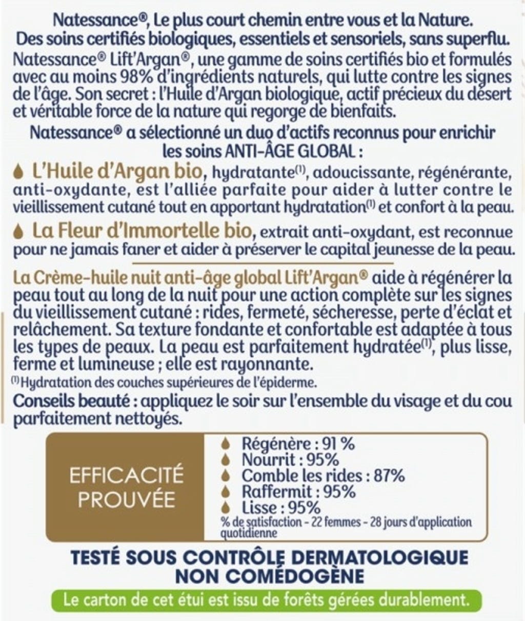 Natessance Lift'Argan Anti-Aldring Krem-Olje Natt, 50 ml