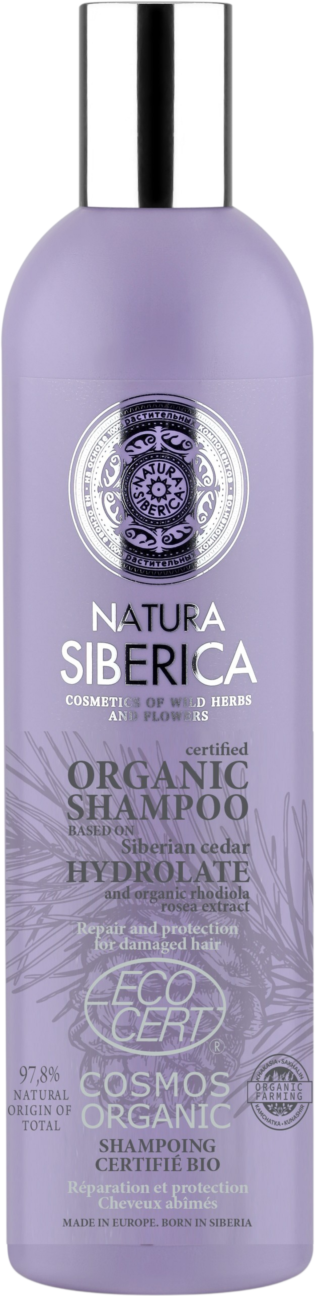 Repair & Protection Shampoo fra Natura Siberica baserer seg på økologisk sedernålshydrolat, renser skadet hår spesielt skånsomt og tilfører det fuktighet. Samtidig har den en styrkende effekt og gjør håret mykt og lett å kamme. Sibirisk seder er rik på essensielle aminosyrer som styrker håret og beskytter det mot skadelige miljøfaktorer. Formuleringen inneholder også rosenrot, hvor nøkkelingrediensene Rosavin, Rosarin og Kolofonium finnes kun i den sibirske varianten av planten.