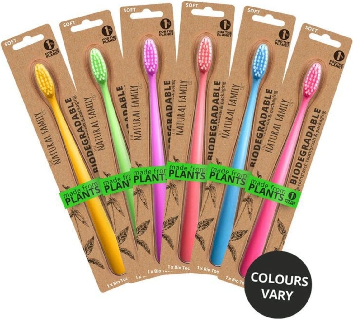 Få farge inn på badet! De neonfargede tannbørstene er både lystige og miljøvennlige. Håndtaket er laget av maisstivelse og er biologisk nedbrytbart, akkurat som emballasjen. Børstene er laget av myk, BPA-fri nylon og passer både for barn og voksne.