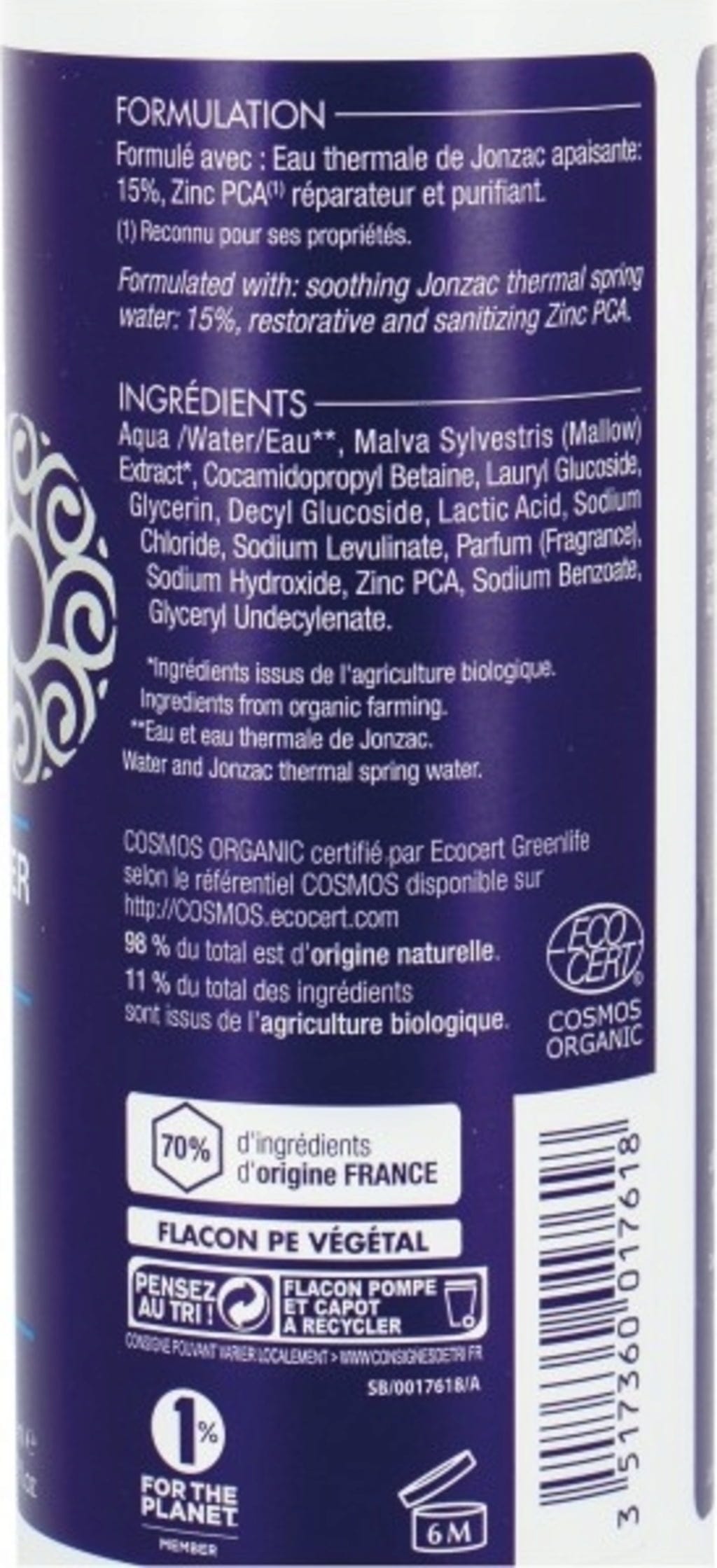 Aqua[1], Malva Sylvestris Extract[2], Cocamidopropyl Betaine, Lauryl Glucoside, Glycerin, Decyl Glucoside, Lactic Acid, Sodium Chloride, Sodium Levulinate, Parfum, Sodium Hydroxyde, Zinc Pca, Sodium Benzoate, Glyceryl Undecylenate