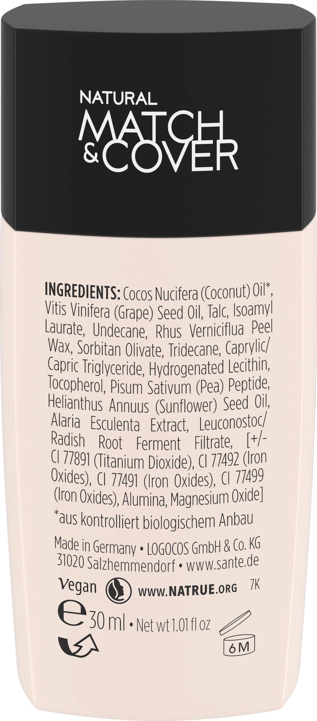 Cocos Nucifera (Coconut) Oil[1], Vitis Vinifera Seed Oil, Talc, Isoamyl Laurate, Undecane, Rhus Verniciflua Peel Wax, Sorbitan Olivate, Tridecane, Caprylic/Capric Triglyceride, Hydrogenated Lecithin, Tocopherol (Vitamin E), Pisum Sativum Peptide, Helianthus Annus (Sunflower) Seed Oil, Alaria Esculenta Extract, Leuconostoc/ Radish Root Ferment Filtrate, Kan inneholde (+/-)[ CI 77891 (Titanium Dioxid), CI 77492 (Iron Oxide), CI 77492 (Iron Oxide), CI 77492 (Iron Oxide), Alumina, Magnesium Oxide]