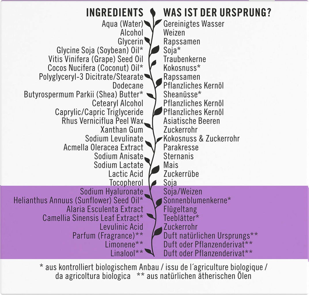 Aqua, Alcohol Denat, Glycerin, Glycerin Soja Oil[1], Vitis Vinifera Seed Oil, Cocos Nucifera (Coconut) Oil[1], Polyglyceryl-3 Dicitrate/Stearate, Dodecane, Butyrospermum Parkii (Shea) Butter[1], Cetearylalcohol, Caprylic/Capric Triglyceride, Acmella Oleracea Extract, Camelia Sinensis Leaf Extract[1], Alaria Esculenta Extract, Sodium Hyaluronate, Rhus Verniciflua Peel Wax, Xanthan Gum, Sodium Levulinate, Levulinic Acid, Sodium Anisate, Sodium Lactate, Lactic Acid, Tocopherol (Vitamin E), Helianthus Annus (Sunflower) Seed Oil[1], Parfum[2], Limonene[2], Linalool[2]
