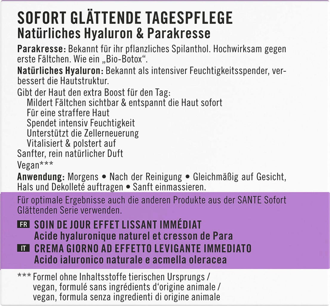 Enten for mer moden hud eller for å forebygge rynker, viser denne ansiktskremen sine spesielle egenskaper. Det naturlige hyaluronsyret plumper huden innenfra og gir intens fuktighet, mens spilanthes reduserer rynker og gir en strålende vakker hud.