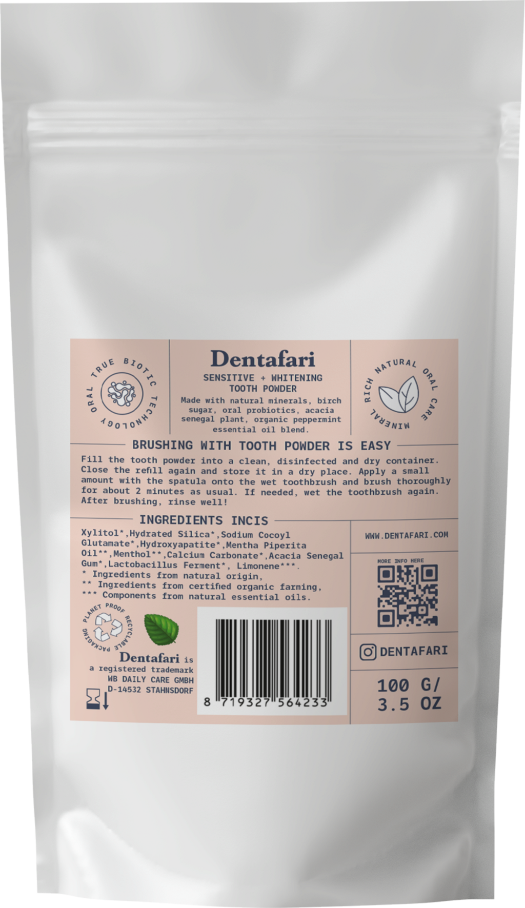 Dentafari tannpulver er spesielt utviklet for sensitive tenner og tannkjøtt. Med milde pusskrystaller av kiselsyre fjerner pulveret skånsomt belegg og misfarging uten å skade emaljen. Sammen med xylitol, Lactobacillus-fermenter og akasie-gummi, gir det tredobbel beskyttelse ved å forebygge karies, skape et alkalisk miljø i munnhulen og fremme remineralisering. Takket være hydroksylapatitt, en kilde til kalsium og fosfat, vil du også nyte et hvitere og jevnere tennoverflate. Den mintaktige smaken gir en langvarig følelse av renslighet og friskhet.
