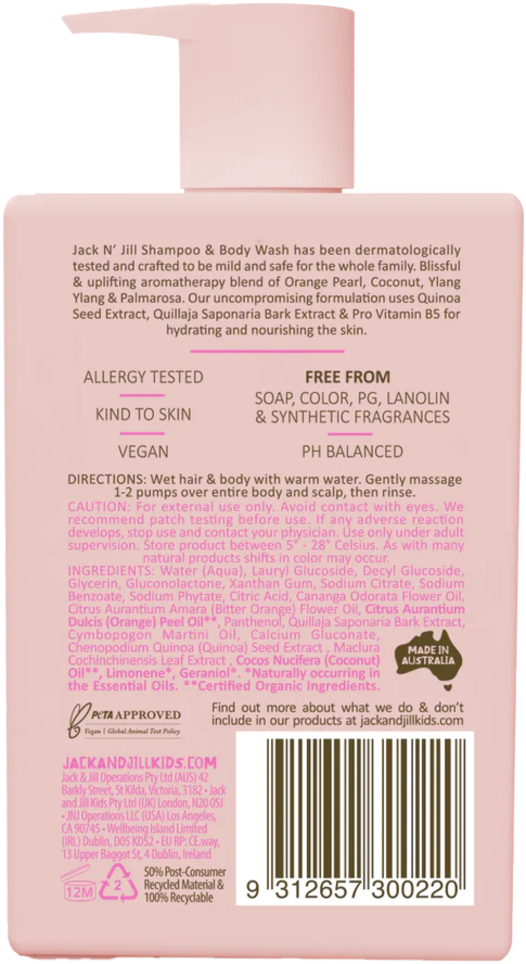 Luxuriøs, guddommelig og oppkvikkende er bare noen av ordene Jack 'N Jill bruker for å beskrive dette produktet. Det er en naturlig renser for hår og kropp som, takket være sin sulfatfrie formel med ekstrakter fra quinoa, såpetre og provitamin B5, er spesielt mild mot huden. Sjampoen og vaskelotionen gir også en aromaterapeutisk opplevelse med oljer fra søtappelsin, ylang ylang og kokosnøtt som skjemmer bort sansene. Produktet rengjør uten å tørke ut huden, og etterlater en behagelig følelse.