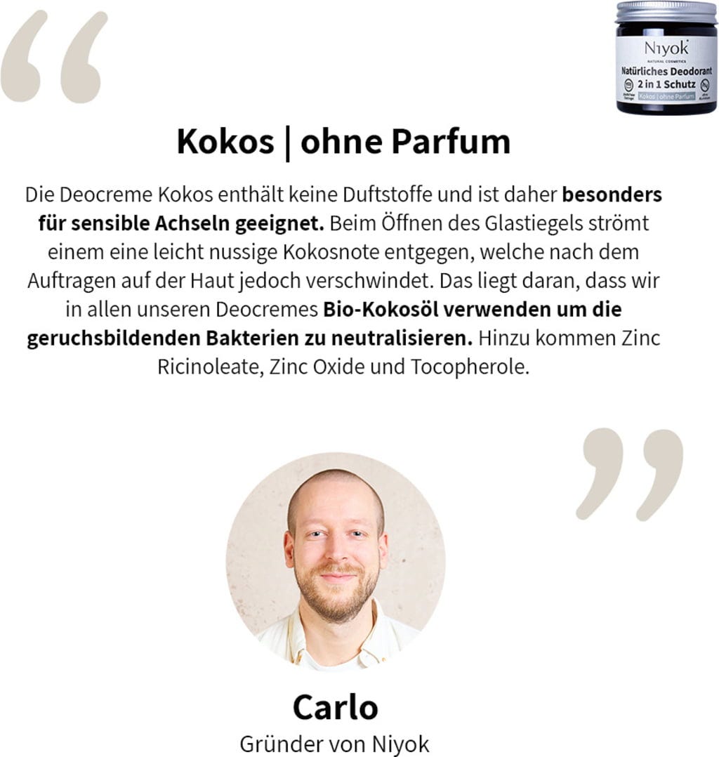 Denne deodoranten beskytter mot ubehagelige kroppslukter og svette. Naturlig kokosolje pleier huden og gir fuktighet, mens den lett nøtteaktige duften gir en behagelig opplevelse. Helt uten parfyme og spesielt skånsom mot huden.